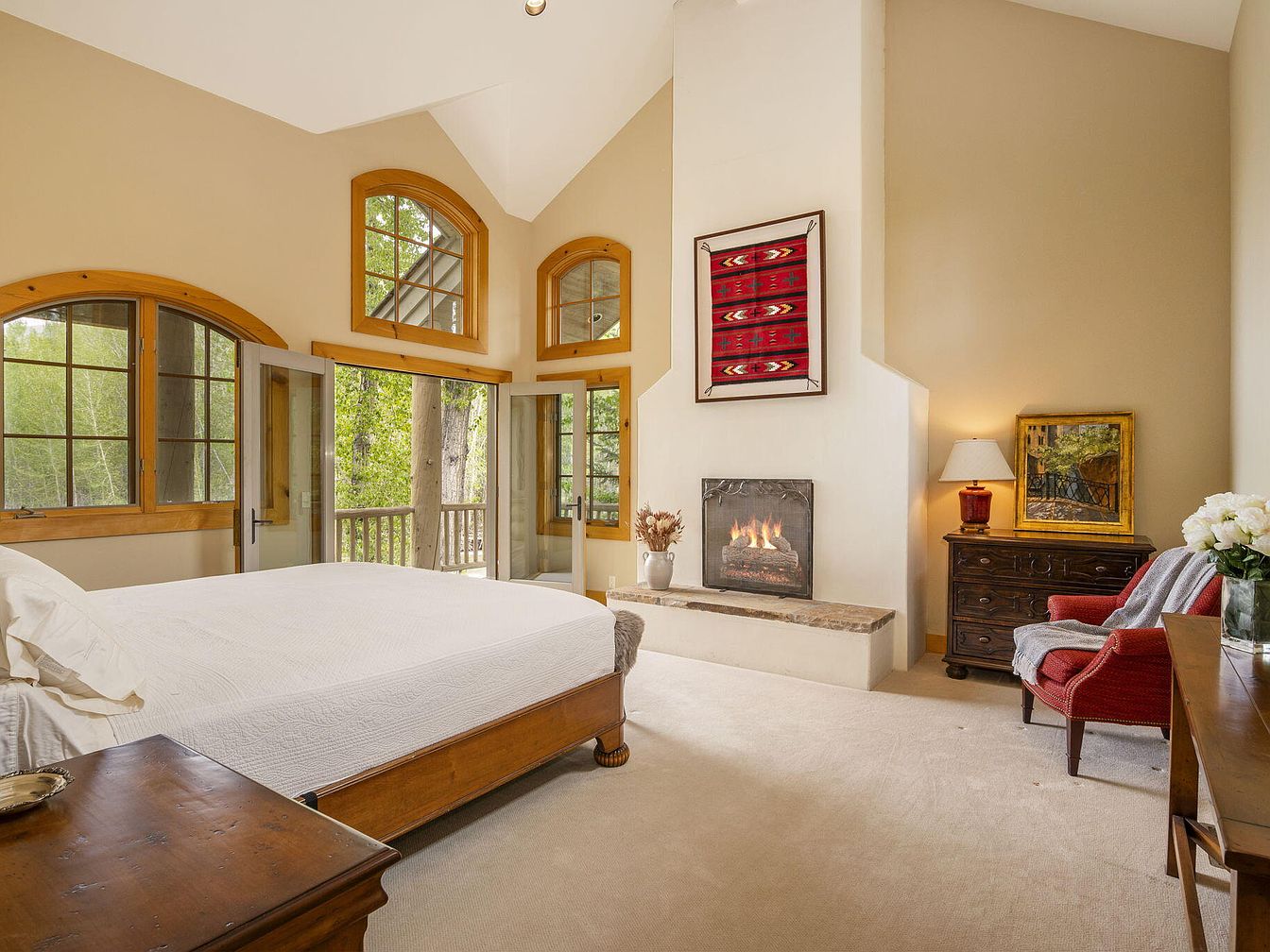A spacious master bedroom bathes in natural light from tall windows and French doors that open to a serene balcony. The room features a vaulted ceiling, light beige walls, and soft carpeting, creating a warm and inviting atmosphere. A central fireplace with a rustic stone hearth and vibrant textile art above adds cozy charm, perfect for family relaxation. Sturdy wooden furniture, including a king-size bed and dresser, grounds the airy space, while a plush red armchair and decorative accents offer comfort and style. This layout ensures ample room for movement, making it practical and safe for families.