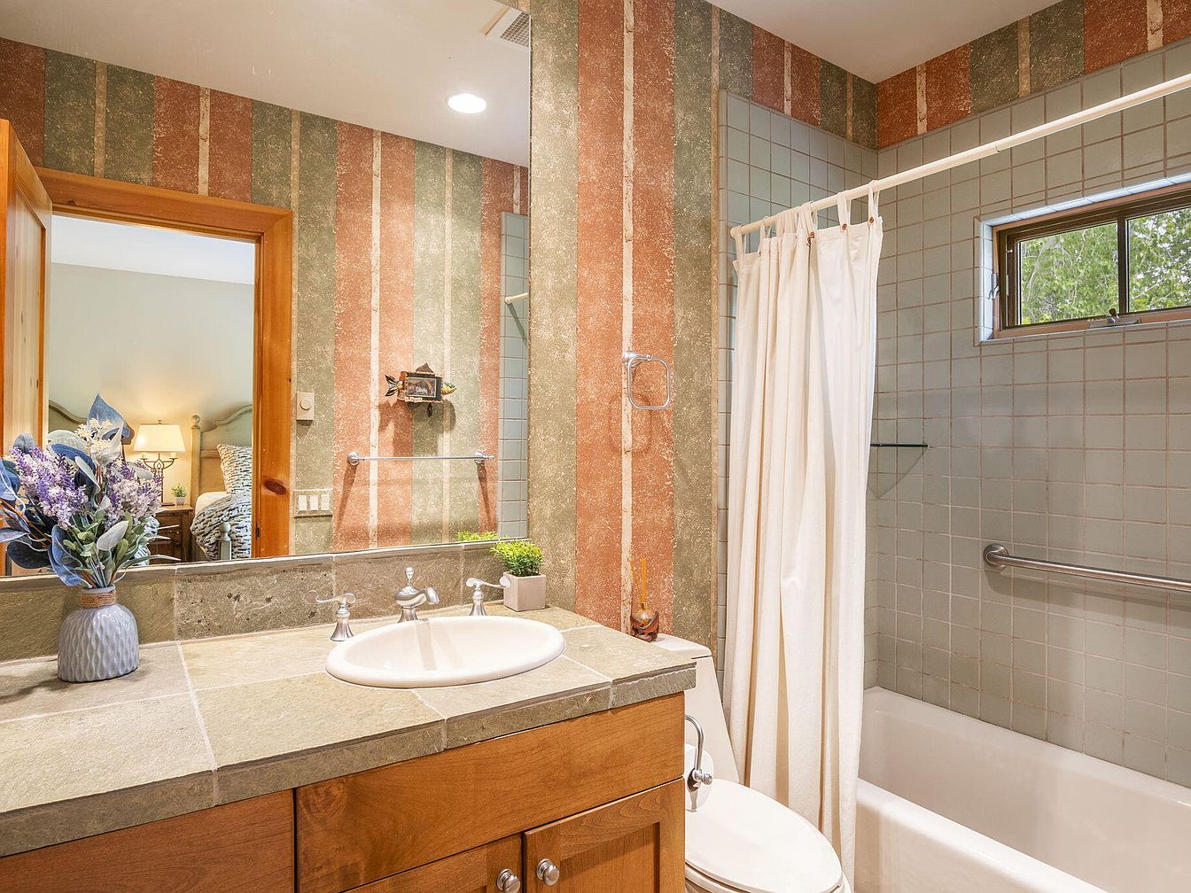 A functional yet inviting bathroom featuring a robust stone-tiled vanity with a white under-mount sink and classic chrome fixtures, accented by warm wooden cabinetry below. The aesthetic combines earthy tones with playful vertical stripes on the wallpaper, bringing depth and character to the space. Soft grey shower tiles enclose the tub, enhanced by a safety grab bar and a simple white curtain, making it both accessible and family-friendly. Thoughtful touches such as a potted lavender arrangement and decorative plants add freshness. Natural light filters in through a small window, creating a welcoming environment for families.