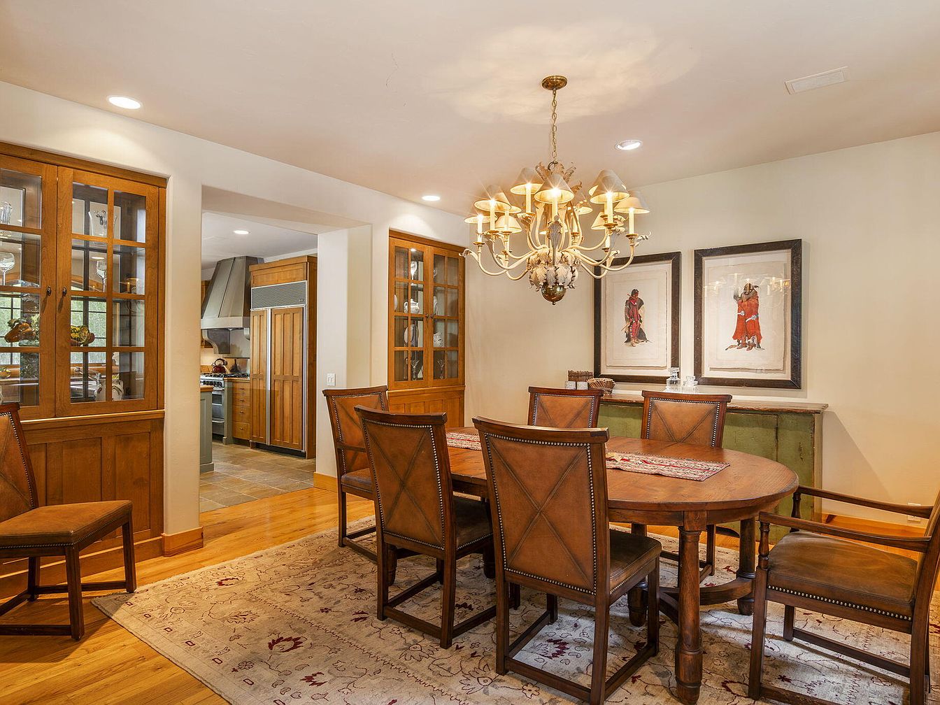 A welcoming dining room showcases an oval wooden table surrounded by six matching leather chairs, perfect for family gatherings or entertaining friends. Built-in glass front cabinets provide both storage and display space for cherished dishware, while the honey-toned hardwood floor enhances the cozy atmosphere. Overhead, a statement chandelier adds elegance and soft illumination. Neutral wall tones keep the space light and inviting, complemented by a muted, patterned area rug that grounds the room. Two framed artworks bring personality to the space, and the open doorway connects seamlessly to the modern kitchen, making mealtimes convenient and social.