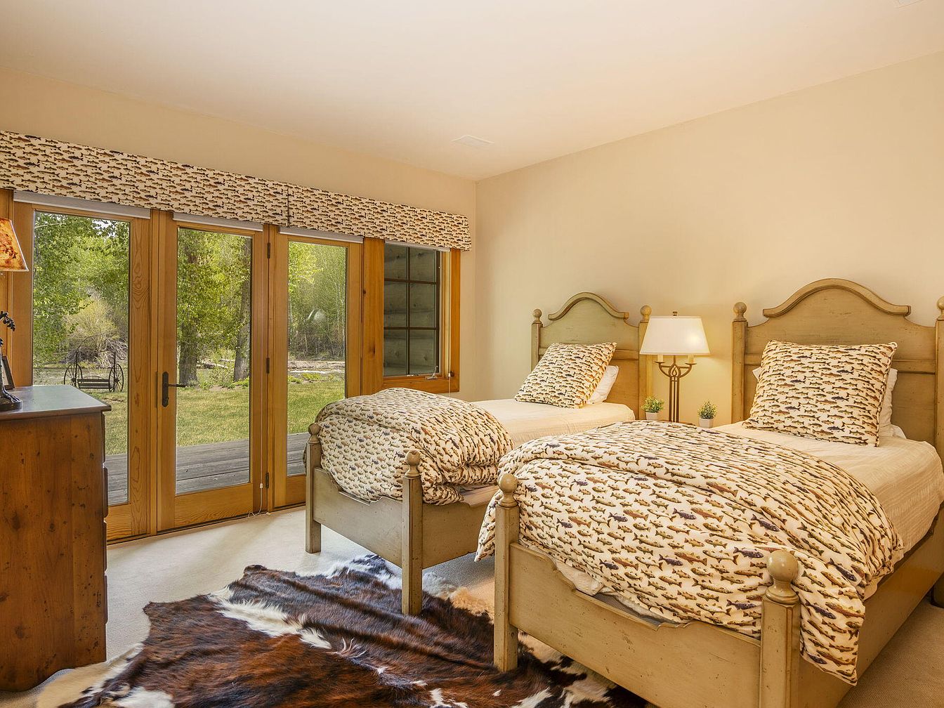 A warm and inviting twin bedroom features two rustic wooden beds, each adorned with soft, patterned bedding in earth tones that complement the neutral walls. Large glass doors stretch across one side of the room, filling the space with natural light and offering peaceful views of a lush green backyard. A rich cowhide rug adds a touch of cozy character and playfulness, perfect for children or guests. The decor is gentle and welcoming, with a nature-inspired valance and simple, functional furnishings like a wood dresser and a bedside lamp, creating a harmonious, family-friendly atmosphere ideal for relaxation.
