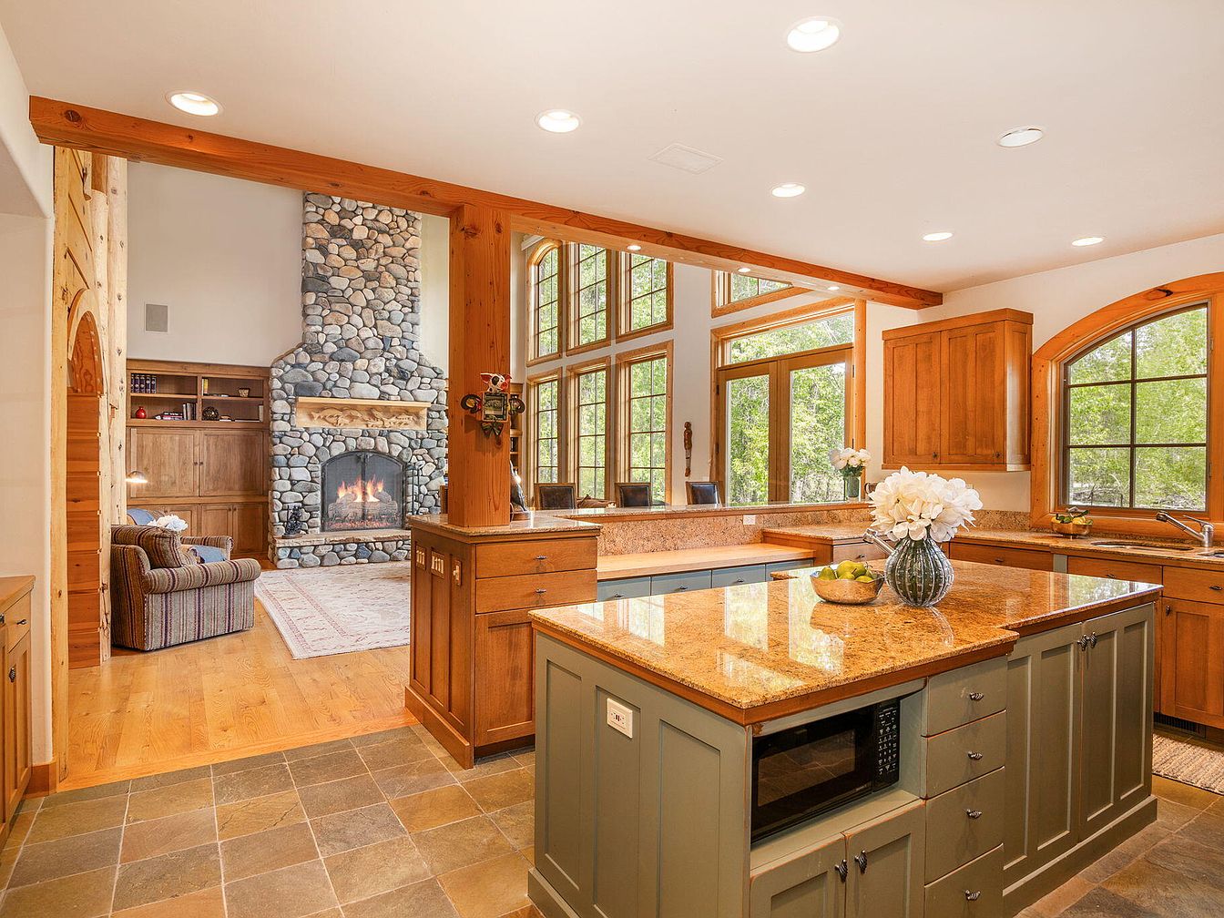 This open-concept kitchen and living area provides a welcoming and family-friendly environment, highlighted by natural wood elements and expansive windows that let in ample natural light. The kitchen features warm wooden cabinetry, stone countertops, and a spacious island perfect for meal prep and casual gatherings. Adjacent to the kitchen, the living area boasts a stunning stone fireplace, built-in wood shelves, and plush seating, making it ideal for family activities or relaxing evenings. The harmonious color palette of beige, grey, and wood tones complements the lush greenery visible through the oversized windows, creating a cozy yet vibrant atmosphere.