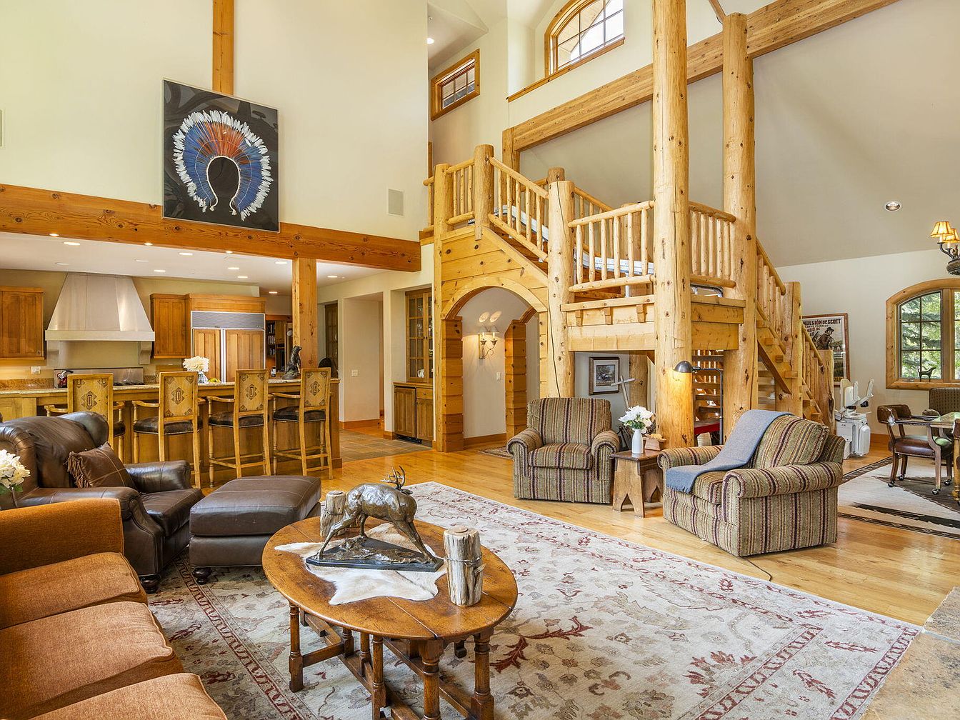 A spacious, inviting open-plan living area beautifully blends rustic charm and contemporary comfort. Large exposed wooden beams and logs frame the space, creating a warm, lodge-like atmosphere, complemented by natural hardwood floors and high vaulted ceilings. Cozy seating options, plush armchairs and a soft sectional, are arranged around a central coffee table, perfect for relaxed family gatherings. The area flows seamlessly into the kitchen, highlighted by a striking breakfast bar with custom stools, ideal for casual dining. Neutral earthy tones, patterned textiles, and unique art pieces provide a welcoming and family-friendly vibe, making this a centerpiece of the home.