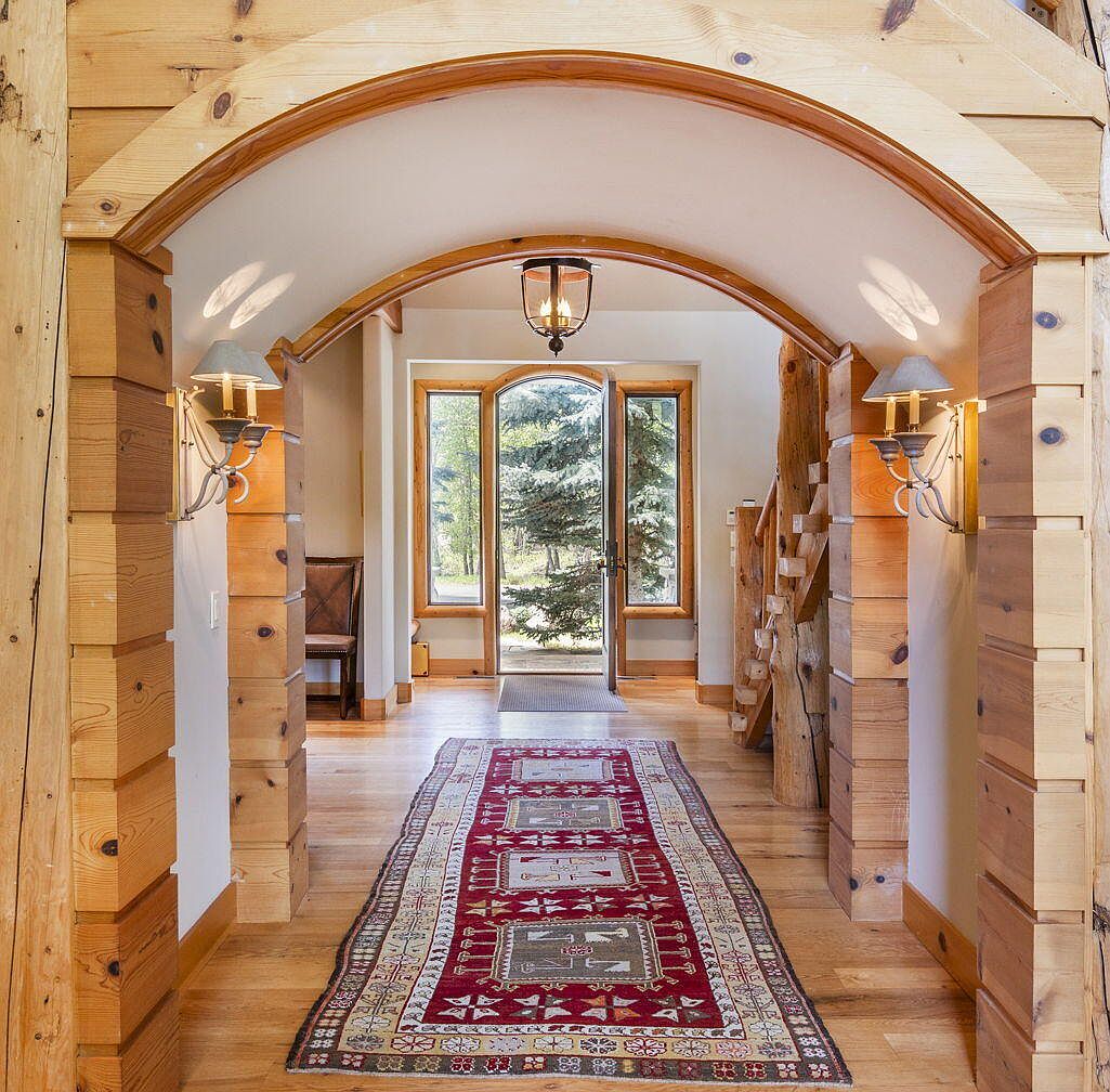 A welcoming hallway entryway features warm wooden accents, an arched ceiling, and rustic beams, creating a cozy first impression. Natural light pours in through large windows and a glass door at the far end, framing outdoor views and brightening the space. The flooring is a honey-toned wood, complemented by an intricately patterned red runner rug that adds warmth and color. Subtle wall sconces provide soft lighting, while the wide, open layout makes it accessible and family-friendly. The sturdy wooden staircase hints at a rustic-modern fusion, blending elegant architectural details with a relaxed, inviting atmosphere.