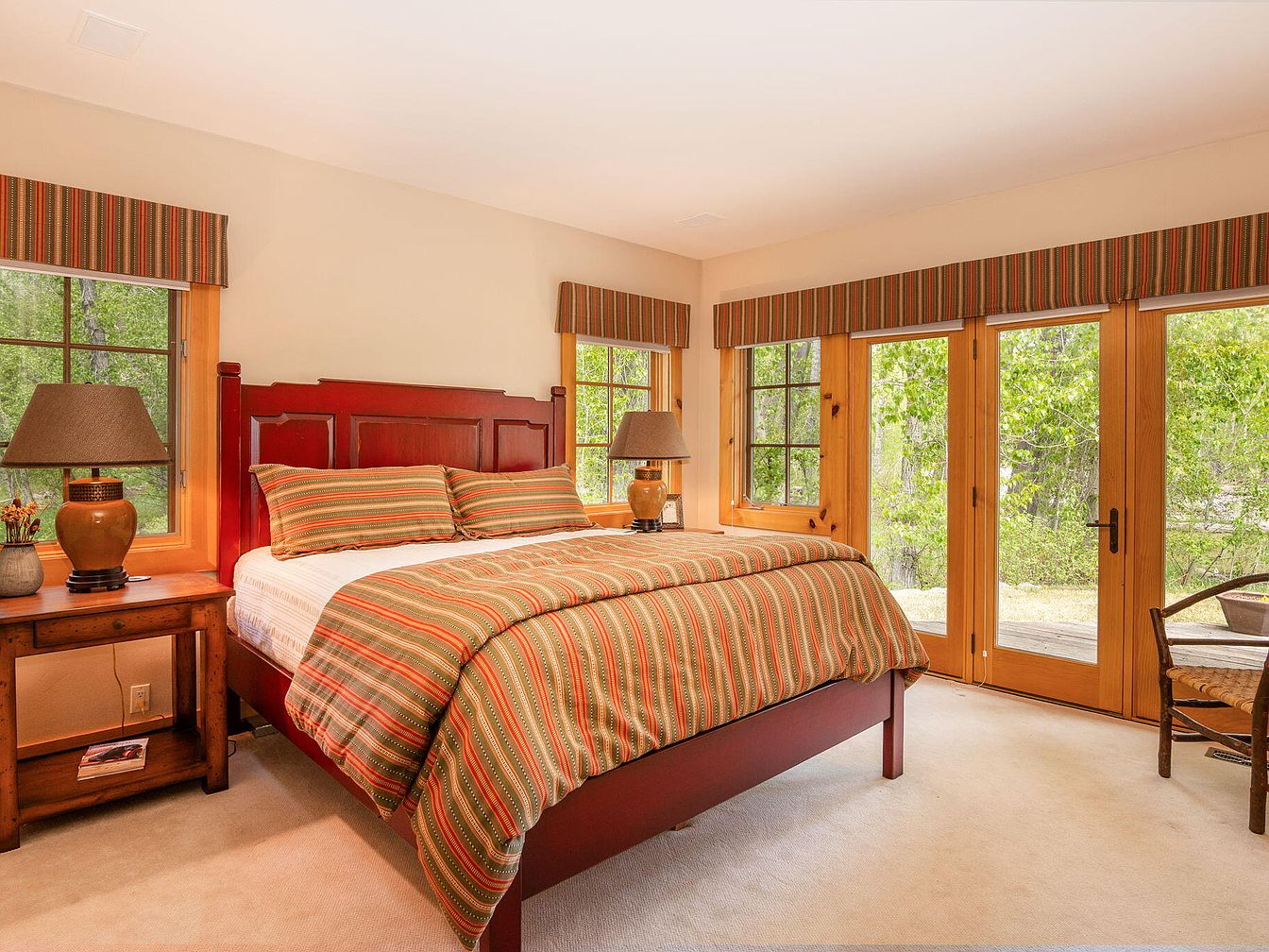 Warm natural light streams through expansive windows and doors, creating a peaceful bedroom sanctuary. The room features a comfortable bed with a bold wooden frame and striped, earth-toned bedding that matches the tailored window valances. Neutral cream carpeting and light beige walls contribute to an inviting, timeless atmosphere. Cozy table lamps and matching wooden nightstands add functional charm beside the bed, while the glass doors lead directly to a lush green outdoor view, perfect for families seeking a blend of indoor comfort and outdoor relaxation. Thoughtfully arranged furnishings maximize both space and serene ambiance, fitting for restful family living.
