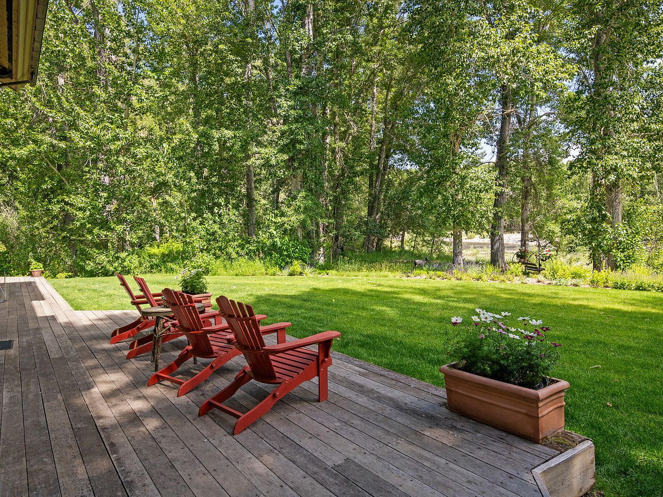 A spacious wooden deck extends into a lush, green backyard, creating an inviting outdoor living area perfect for family gatherings or relaxing afternoons. Four classic red Adirondack chairs are thoughtfully positioned to face the serene backdrop of mature trees, offering both comfort and a striking pop of color. Planter boxes with cheerful flowers enhance the deck’s natural charm, making it appealing for both adults and children. The open layout ensures plenty of space for play and activities, while the surrounding greenery provides privacy and a peaceful atmosphere that seamlessly blends with the landscape.
