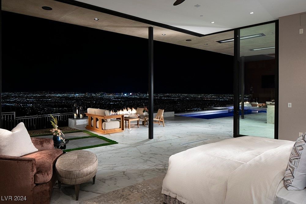 A luxurious modern bedroom seamlessly opens to an expansive terrace, offering a breathtaking panoramic view of the city lights at night. Floor-to-ceiling glass doors retract fully, uniting the indoor sleeping space with the outdoors. The bedroom is styled with soft, neutral tones and elegant, textured furnishings, including a plush velvet armchair and cozy ottoman. A marble floor extends outside, leading to a chic outdoor lounge area featuring comfortable wood seating and a linear fire pit, perfect for entertaining family or relaxing together. The serene pool area provides an additional family-friendly relaxation spot, enhancing the home’s tranquil, sophisticated ambiance.