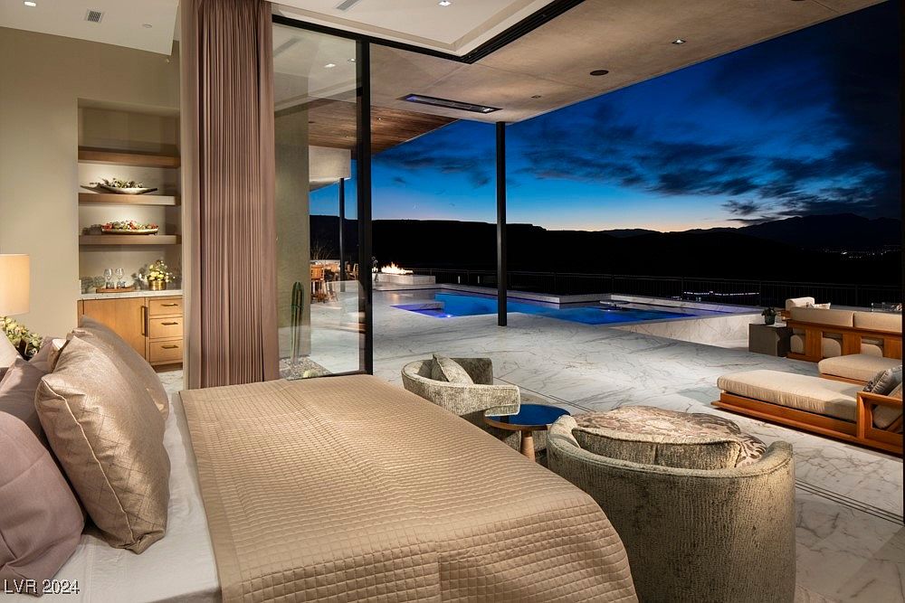 A serene master bedroom seamlessly blends indoor comfort with outdoor luxury through expansive sliding glass doors that open directly to a spacious marble terrace and an inviting pool. The calming neutral palette of soft taupes and sandy beige is complemented by plush bedding, cozy lounge chairs, and elegantly understated built-in shelving, creating a restful retreat. Generous seating areas both inside and out provide space for relaxation and family gatherings. Warm wood cabinetry and ambient lighting add a touch of warmth to the modern architectural lines, while the backdrop of a dramatic twilight sky offers breathtaking views from the comfort of bed.