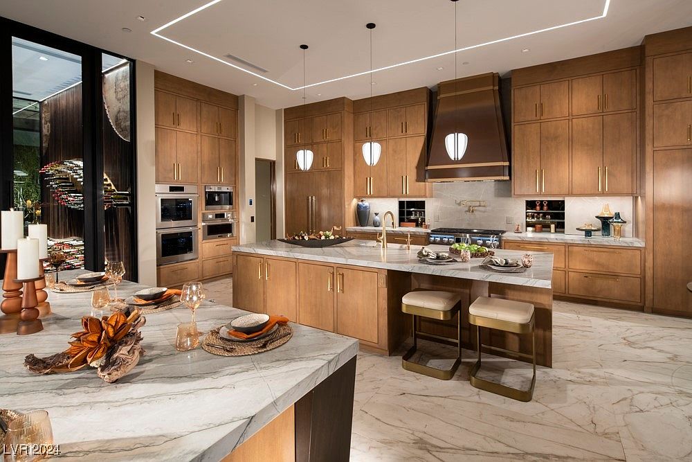 A spacious, contemporary kitchen boasts warm wooden cabinetry with sleek gold hardware, extending from floor to ceiling for optimal storage, making it both practical and family-friendly. The marble countertops and matching backsplash lend an elegant, luxurious touch, while two large center islands offer plenty of space for meal prep and casual dining. Comfortable modern stools make this a welcoming spot for family gatherings or entertaining. Subtle, built-in lighting highlights the high ceilings and minimalist lines, creating an open, airy feel. Neutral tones and natural textures combine for a timeless look that suits both everyday living and special occasions.