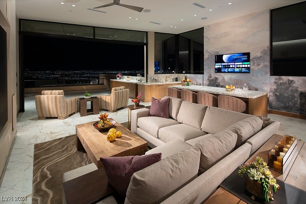 A spacious living room seamlessly connects to a modern bar area, creating a perfect setting for family gatherings and entertaining guests. Floor-to-ceiling windows draw in the stunning cityscape and night views, while an open concept layout encourages interaction. The large sectional sofa, paired with a wooden coffee table and accent chairs, provides ample seating. The color palette blends soothing neutrals, taupes, creams, and soft greys, with rich wood tones for warmth. Sleek marble floors, integrated media wall, and contemporary lighting elevate the elegance. The bar features comfortable upholstered stools and extensive counter space for snacks and drinks, offering both luxury and comfort.