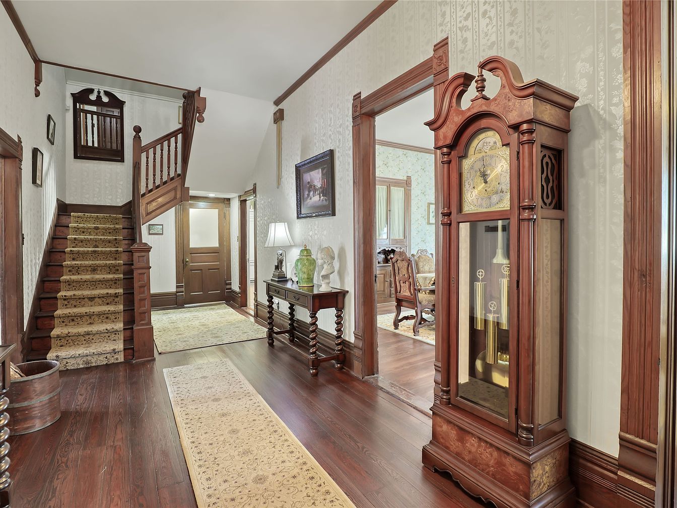 The entryway features a stunning blend of classic elegance and warm hospitality, with rich wooden details accentuating the space. A well-crafted staircase invites guests to explore the upper levels, while the intricately patterned carpet adds a vintage charm. Stylish wainscoting complements the ornate woodwork throughout, reflecting artisanal craftsmanship. A striking grandfather clock stands as a centerpiece, merging functionality with artistry. Soft, ambient lighting from the lamp illuminates the dark wood accents, creating a welcoming atmosphere. The neutral color palette, mixed with hints of floral wallpaper, enhances the light, airy feel, making it a perfect family-friendly entry point.