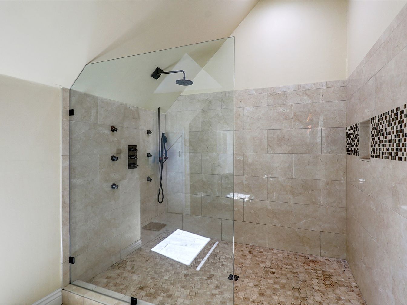 This luxurious shower space features a sleek glass enclosure that complements the modern aesthetic. The natural stone walls and floor deliver a spa-like ambiance, while the high ceiling enhances the feeling of openness. A rainfall showerhead and multiple body sprays provide a customizable experience, ensuring relaxation and comfort. Subtle textures and neutral tones, ranging from cream to soft beige, create a warm and inviting atmosphere. The geometric mosaic accents along one wall add a touch of sophistication, ensuring this space remains both functional and visually appealing. Perfect for a tranquil morning routine or unwinding after a long day.