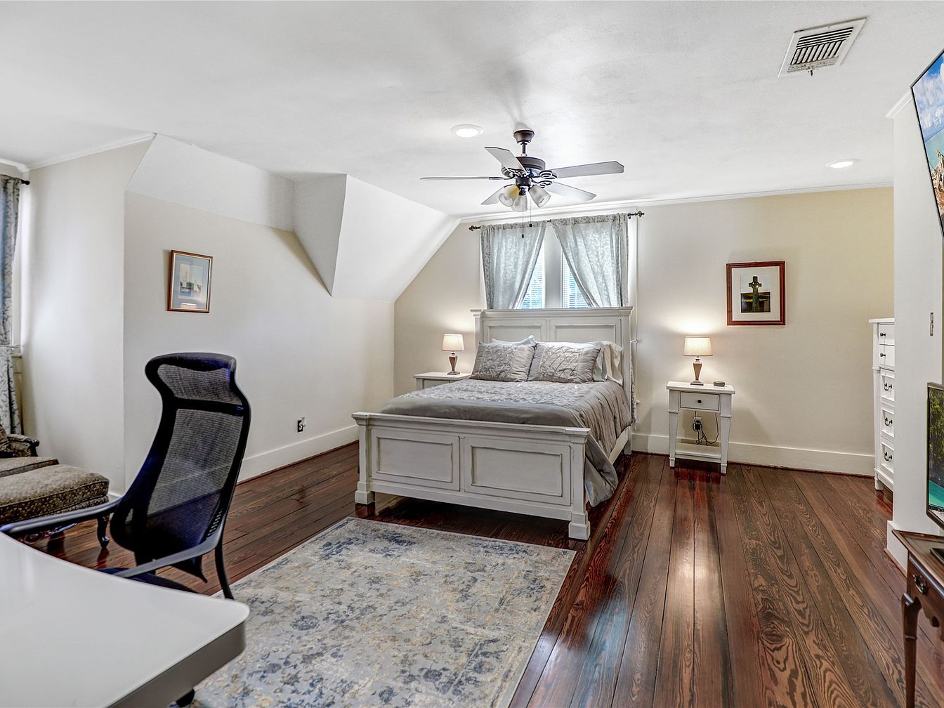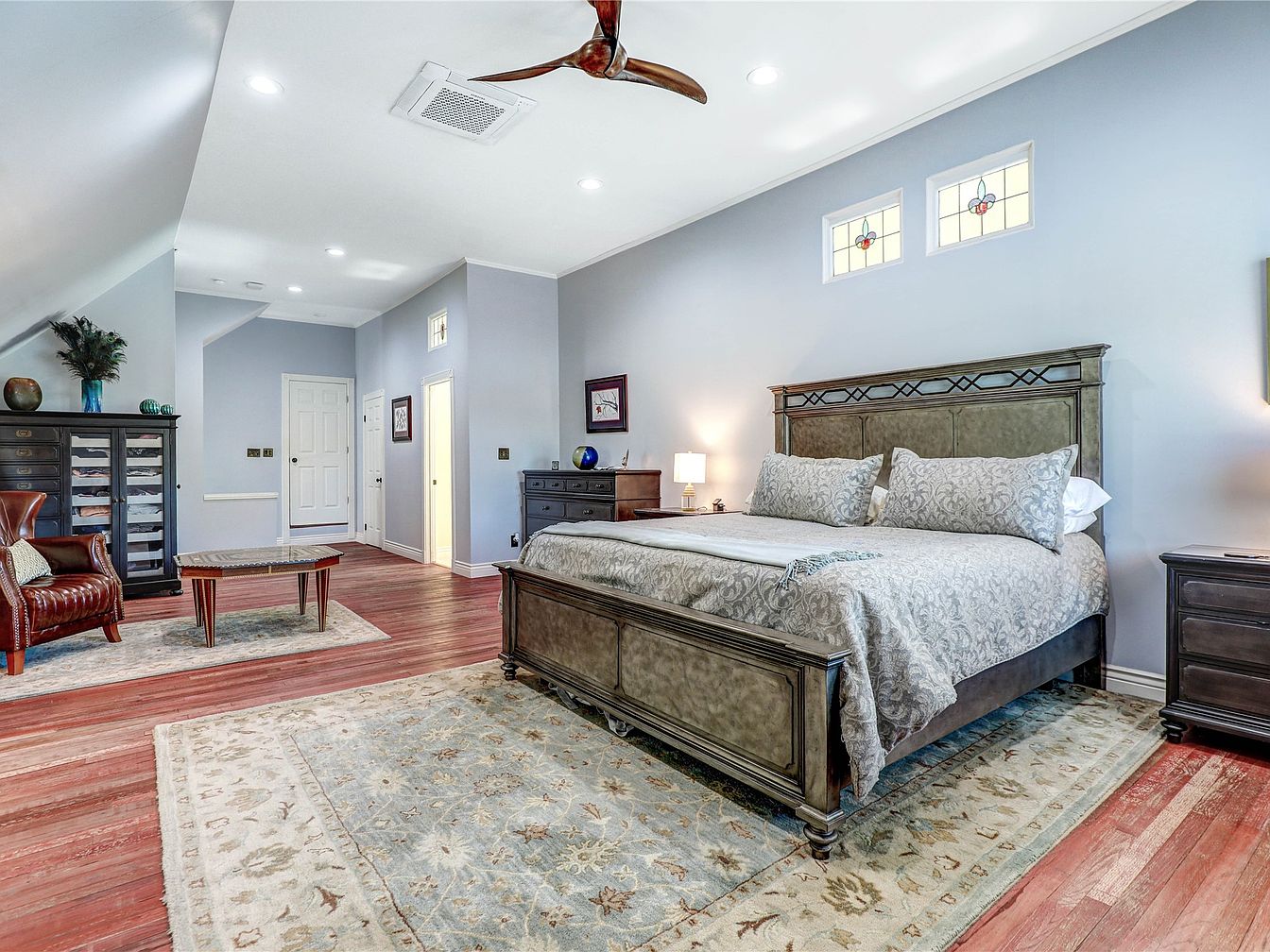 This master bedroom exudes tranquility and comfort with its spacious layout. The soft blue walls complement the elegant hardwood flooring, creating a serene ambiance. A plush king-sized bed, adorned with decorative pillows and a luxurious quilt, serves as the focal point. Subtle architectural details, such as stylish crown molding and delicate stained glass windows, enhance the room’s charm. Dark wood furniture, including a matching nightstand and dresser, contrasts beautifully with lighter tones, while a cozy leather armchair invites relaxation. The space is thoughtfully illuminated by table lamps, ensuring a warm, inviting atmosphere perfect for unwinding.