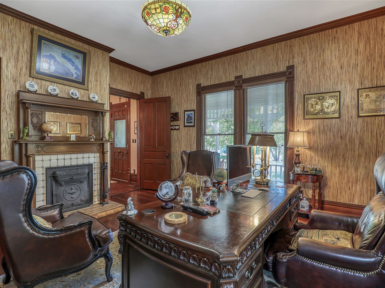 Rich wooden tones and vintage accents define this stunning study room. The centerpiece is a luxurious dark wood desk, intricately carved and paired with plush leather chairs that embody comfort and sophistication. Warm, earthy colors blanket the walls, complemented by a unique stained-glass ceiling light, adding a touch of artistry. Classic decor items, including historical maps and quaint collectibles, adorn the walls and shelves, providing character. Expansive windows flood the space with natural light, enhancing the inviting atmosphere. A fireplace adds warmth and charm, perfect for cozy reading sessions, making this an ideal family-friendly workspace.