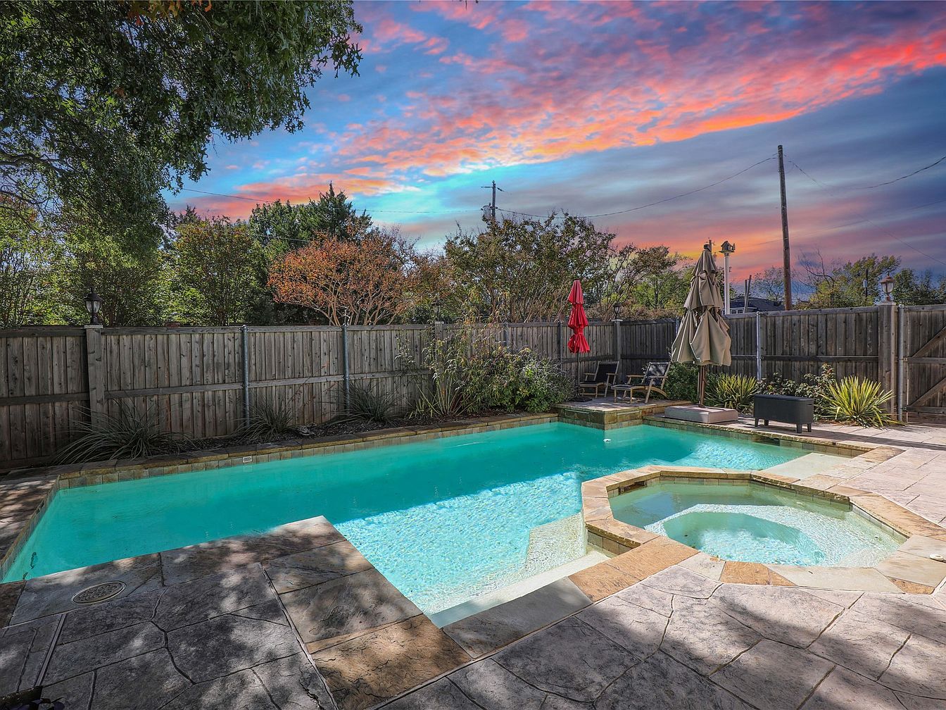 This inviting backyard oasis features a glistening swimming pool complete with an integral hot tub, ideal for relaxation. Surrounded by a natural stone patio, the area blends seamlessly with its lush landscaping, enhancing the outdoor aesthetic. A cozy seating arrangement, complemented by vibrant umbrellas, offers a perfect spot for family gatherings or quiet evenings. The warm color palette of the pool tiles contrasts beautifully with the rich greens of neighboring trees, creating a serene retreat. As dusk approaches, the sky paints a stunning backdrop, turning this space into a picturesque haven for outdoor enjoyment and entertainment.