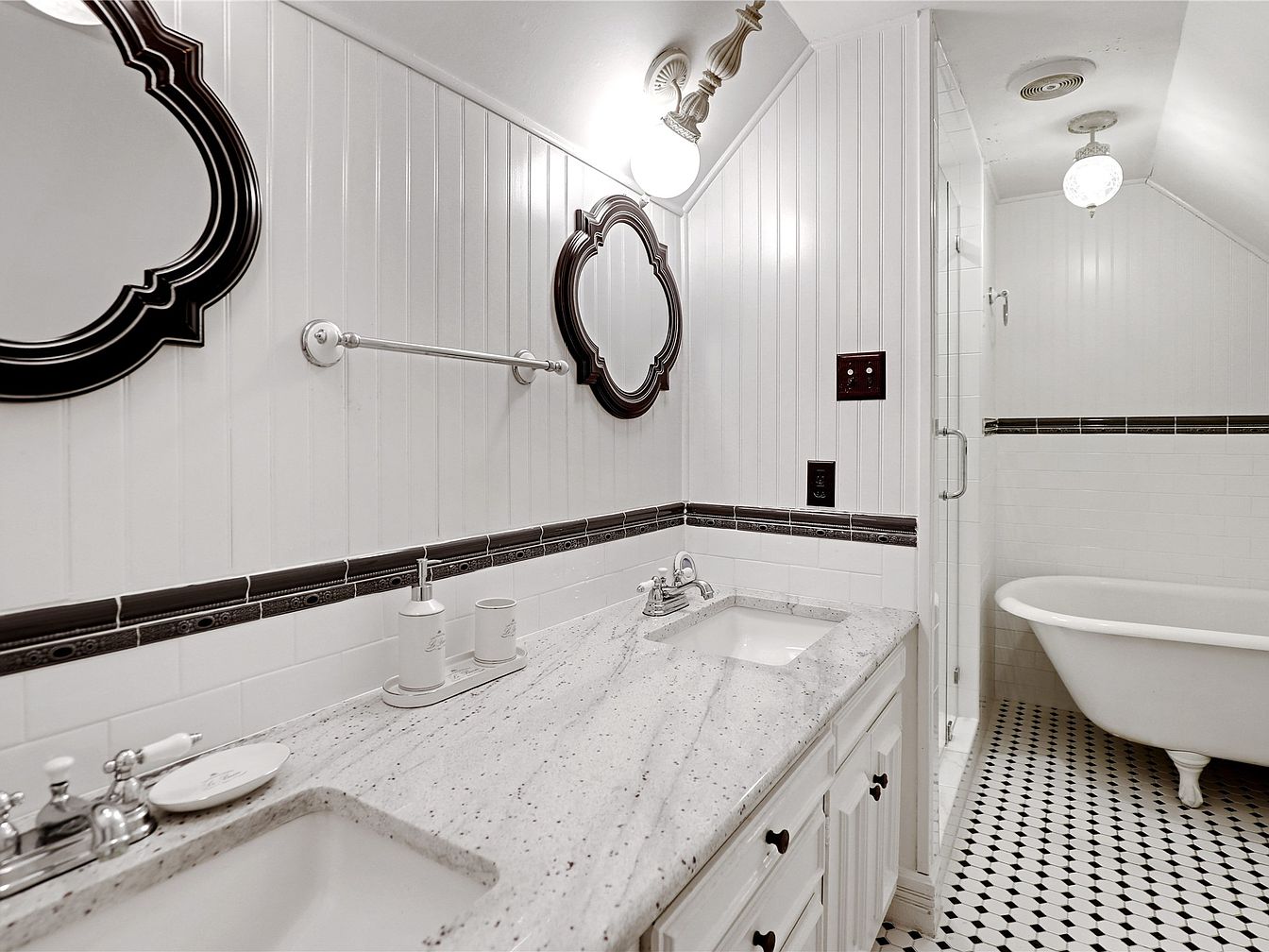 This chic bathroom features a harmonious blend of vintage and modern aesthetics. The granite countertop, adorned with elegant fixtures, offers ample space for toiletries, while the double sink ensures comfort for multiple users. Classic black and white tiles grace the floor, adding a timeless touch, complemented by the distinctive black and white beadboard walls that enhance the room’s height. Two ornate mirrors are framed in rich black, reflecting light from the stylish overhead pendants, creating a bright and inviting atmosphere. A clawfoot tub adds a luxurious focal point, while a spacious glass shower offers convenience, making this bathroom both functional and stylish.