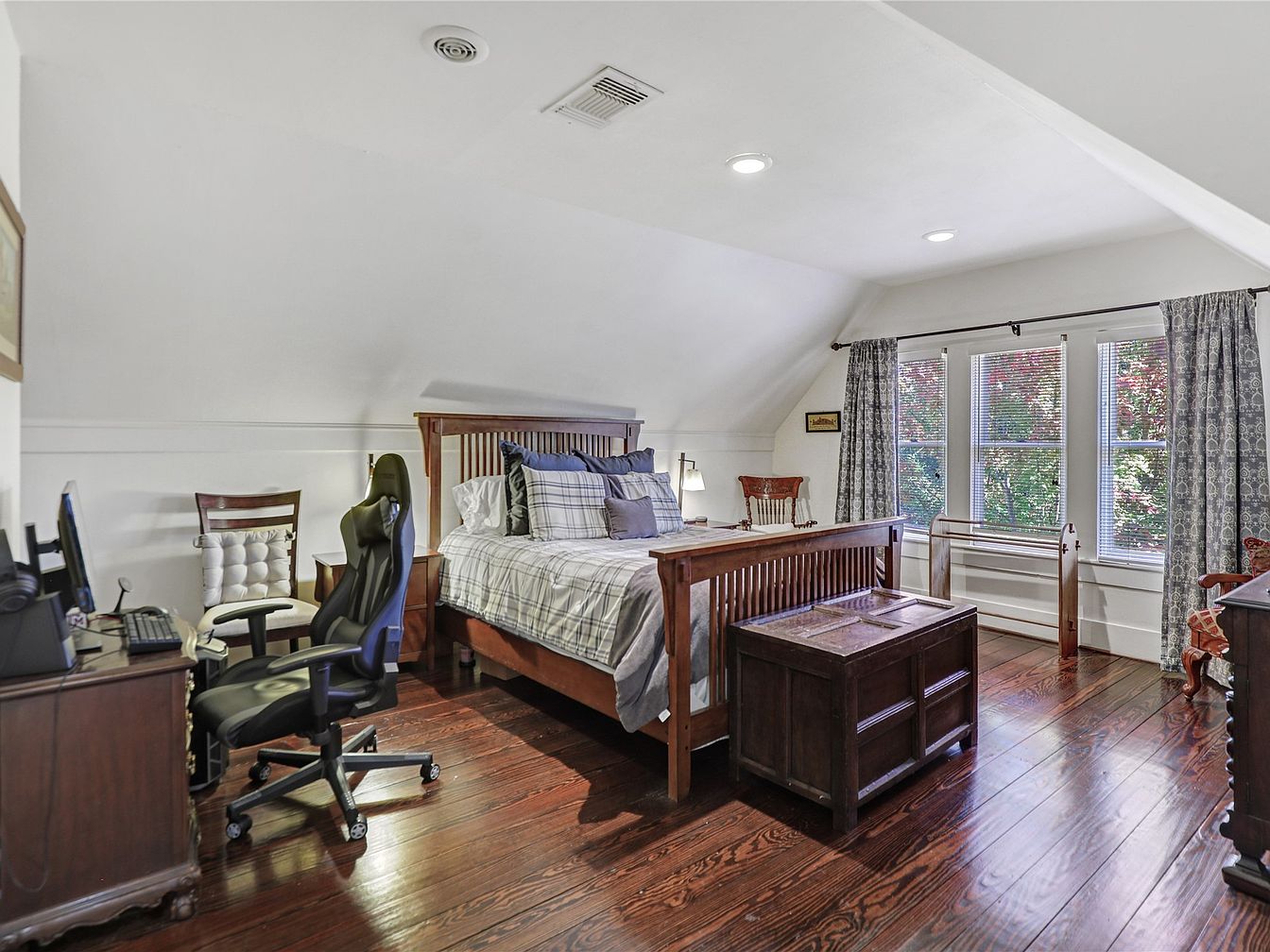 This beautifully designed attic bedroom features a cozy layout with sloped ceilings, enhancing the sense of warmth and intimacy. The rich hardwood floors create a welcoming atmosphere, harmonizing with the rustic wooden bed frame and bedside table. A combination of blue and white plaid bedding adds a touch of classic charm, while the ample window light illuminates the space and offers serene views of the outdoors. Thoughtful touches like a comfortable office chair and sleek desk make this room family-friendly, providing versatile usage for relaxation and productivity. Elegant curtains frame the windows, adding an inviting flourish.