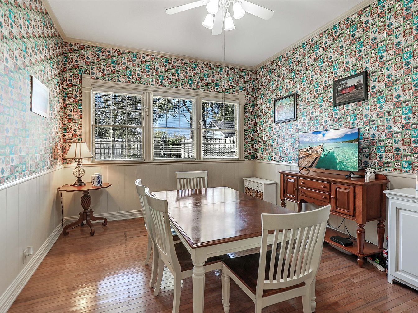 This charming dining room features a spacious layout with hardwood floors and a warm, inviting atmosphere. The wallpaper showcases a colorful, vintage design that adds character and a touch of whimsy to the space. Large windows flood the room with natural light, creating a cheerful environment perfect for family gatherings. A classic wooden dining table, surrounded by white chairs, provides a cozy dining experience, while a sideboard offers additional storage. The elegant lamp and wall art enhance the aesthetic, combining functionality with style, making this dining room ideal for shared meals and cherished memories.