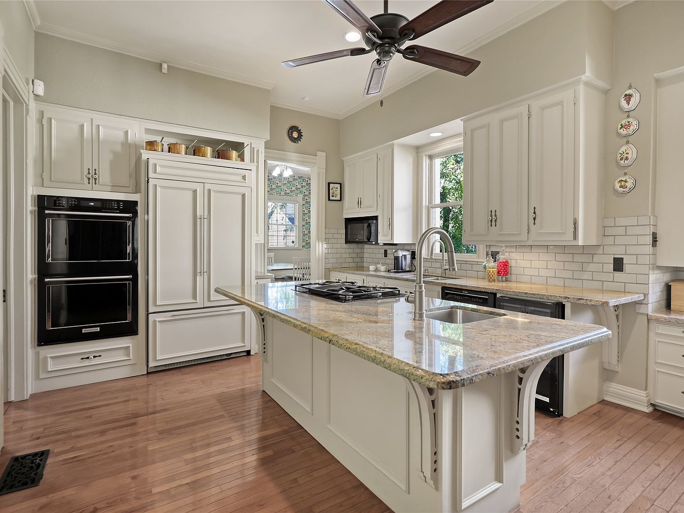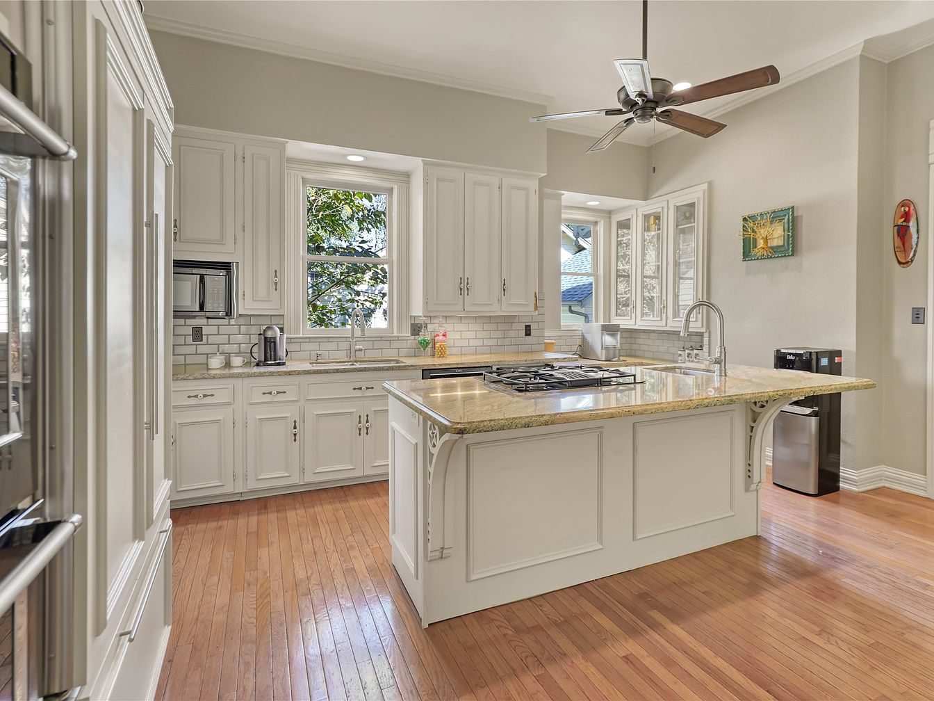 This modern kitchen showcases an inviting layout, centered around a spacious granite island perfect for meal preparation and family gatherings. Crisp white cabinetry complements the warm wooden flooring, creating a harmonious balance. Natural light floods the space through large windows, emphasizing the elegant details like the decorative trim and stainless steel appliances. A stylish ceiling fan enhances airflow, while the cozy corner seating offers a casual nook for morning coffee. The backsplash adds a subtle texture, pairing beautifully with the stainless accents. This space is designed not just for cooking, but for creating lasting family memories.