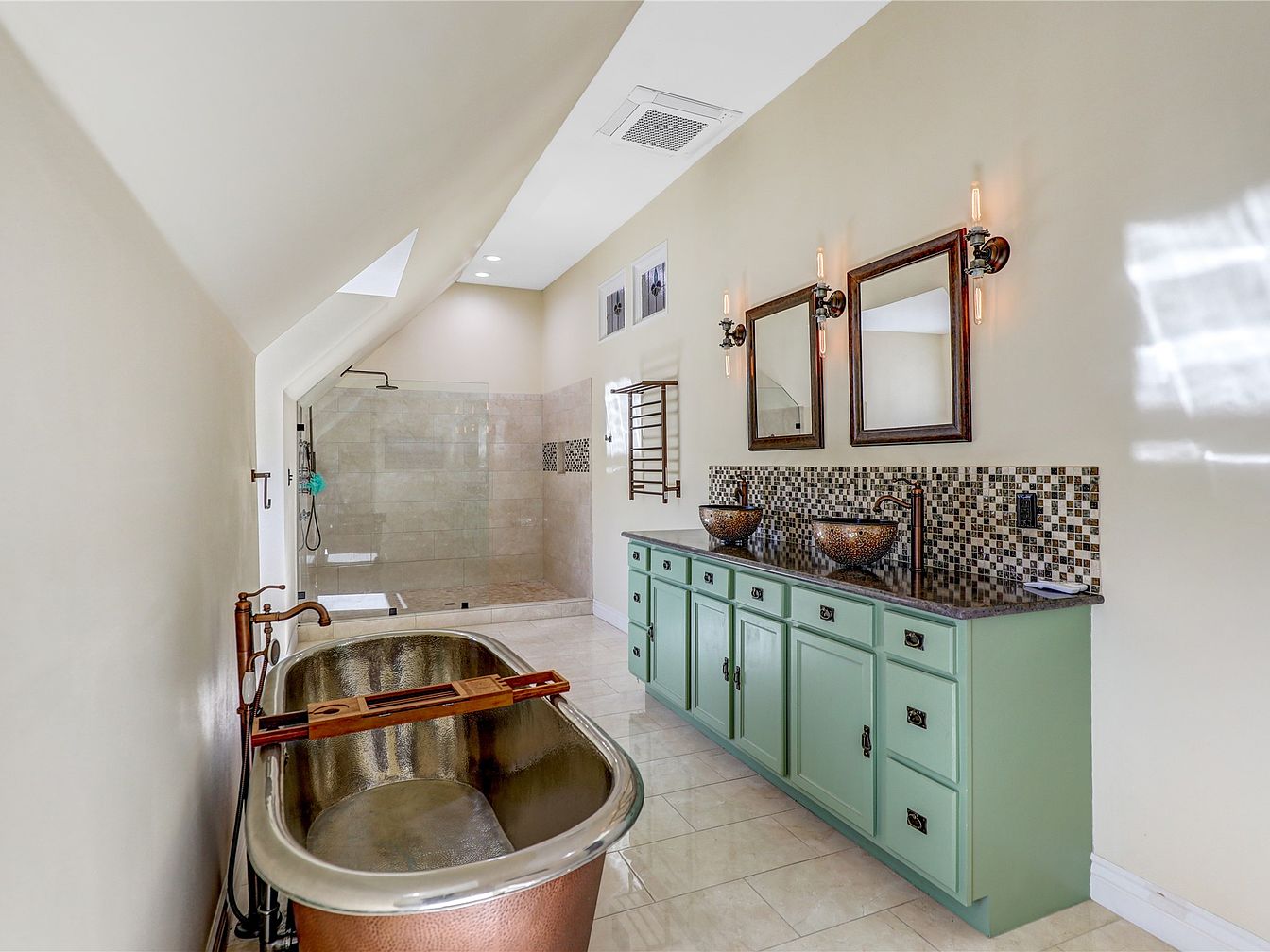 This luxurious bathroom boasts an elegant design with a harmonious blend of modern and rustic elements. A freestanding copper tub serves as the centerpiece, complemented by a wooden tray for convenience. The tranquil color scheme features soft beige walls that enhance the spacious feel, while the mint-green double vanity provides ample storage and a stylish contrast. Mosaic tiles behind the vessel sinks add texture and sophistication. Natural light floods the room through skylights, highlighting the detailed craftsmanship in the sleek shower enclosure. Thoughtfully designed, this space invites relaxation and rejuvenation for the entire family.