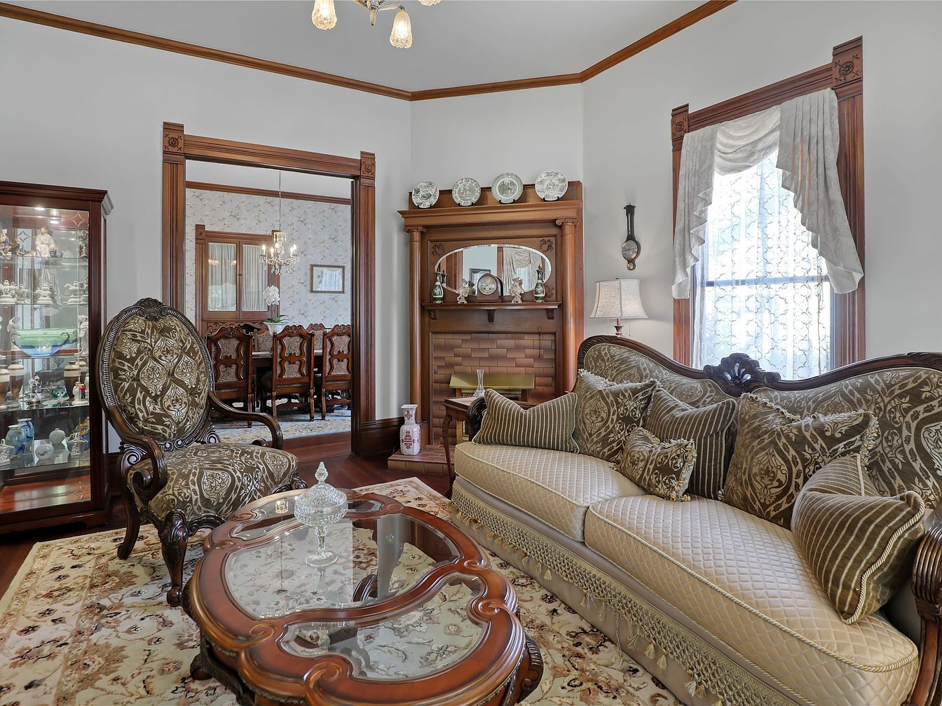 A beautifully designed living room exuding vintage charm, featuring intricate woodwork that frames an inviting layout. Plush seating, including a luxurious sofa adorned with decorative pillows, creates a welcoming atmosphere ideal for family gatherings. An ornate armchair with rich upholstery complements the space, while the glass coffee table adds a touch of sophistication. Light streams through elegant drapes, enhancing the warm color palette of cream, brown, and gold. A stunning display cabinet showcases cherished collectibles, and the tasteful fireplace with detailed tiling serves as a cozy focal point, making this living area perfect for relaxation and entertaining.