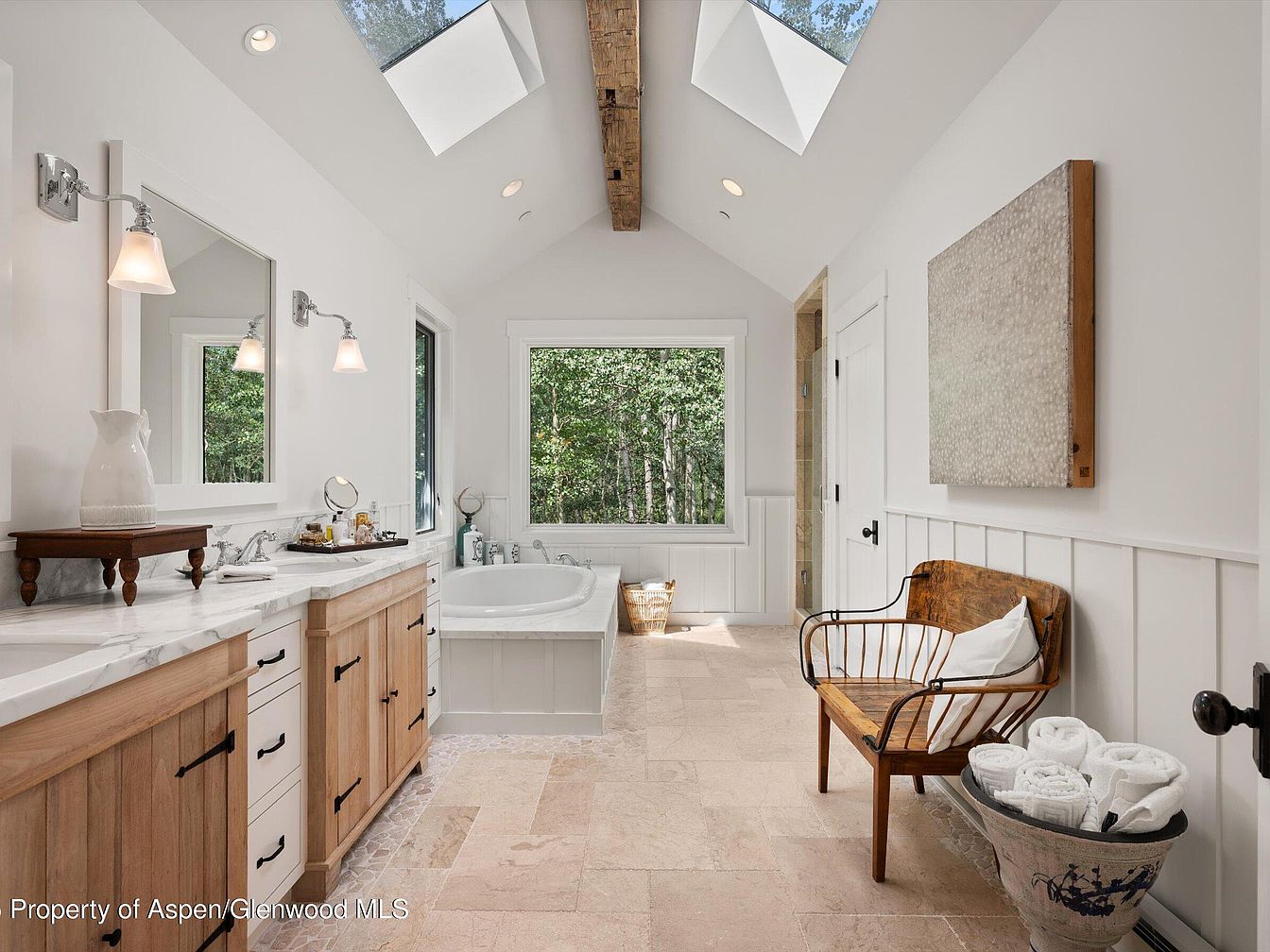 This serene bathroom blends rustic charm with luxury, featuring natural wood cabinetry, white marble countertops, and a deep soaking tub positioned by a large window that floods the space with daylight and offers tranquil views of the surrounding forest. Skylights and exposed beams enhance the airy, open feel, while stone tile floors and crisp white walls create a clean and inviting atmosphere. A rustic wooden bench with plush pillows invites relaxation and provides family-friendly seating, alongside a large basket filled with fresh towels for convenience. Thoughtful artwork and ample storage make this bathroom both elegant and functional for family living.