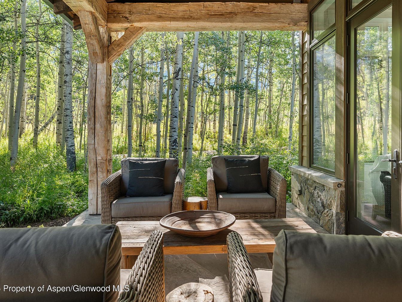 This inviting covered patio blends rustic charm with natural beauty, offering a serene retreat perfect for gatherings or family relaxation. The space features sturdy exposed timber beams and natural stone accents that create a warm, organic aesthetic. Woven rattan armchairs with plush gray cushions are arranged around a solid wooden coffee table, fostering a comfortable and social atmosphere. Large windows allow abundant natural light and seamless views of the surrounding aspen woods, making it ideal for parents to keep an eye on children playing nearby. The calming earth-tone palette and robust furniture ensure both style and durability for family enjoyment.