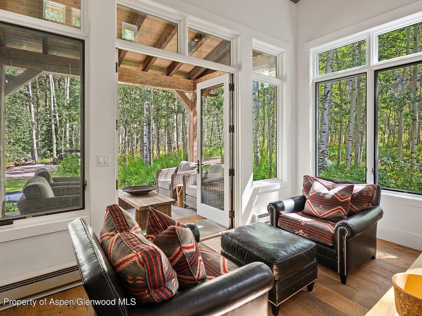 This inviting sunroom opens seamlessly onto a covered patio, blending indoor comfort with scenic woodland views. Expansive floor-to-ceiling windows bathe the space in natural light, creating a serene ambiance ideal for relaxation or family gatherings. The room features two plush black leather armchairs, each accented with cozy, patterned cushions in warm earth tones that echo the colors of the forest outside. A matching ottoman and rustic wooden coffee table add both functionality and charm. Crisp white trim and light oak flooring enhance the airy design, while the open access to the patio encourages outdoor play and easy entertaining.