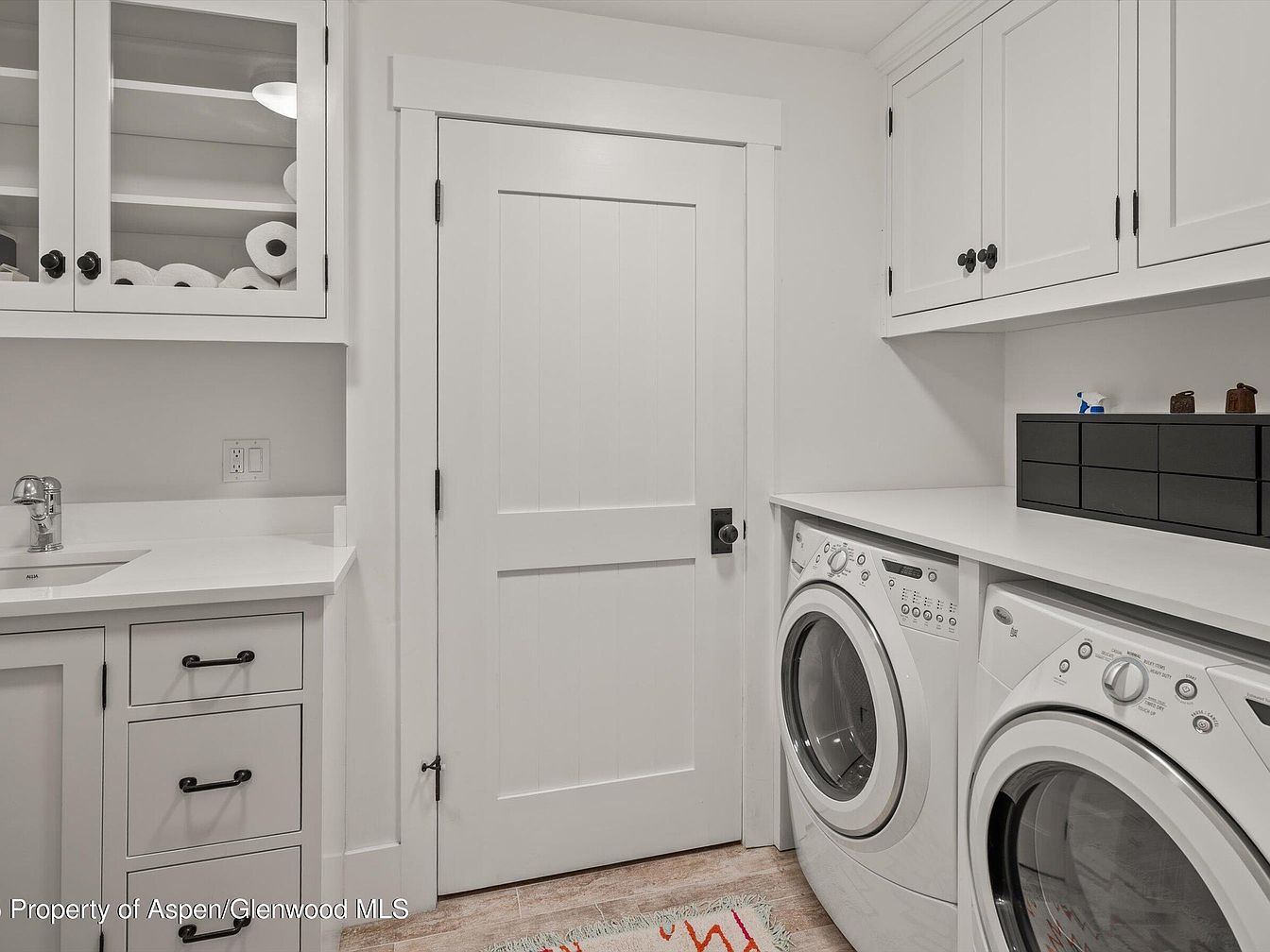 A beautifully organized laundry room featuring modern front-loading washer and dryer units tucked neatly under bright white countertops, creating a seamless workspace. Crisp white cabinetry with dark hardware provides ample storage, including upper and lower cabinets for essentials, and a dedicated display area for supplies. The soothing all-white palette is contrasted by the warm tone of the wood-look flooring, which adds a cozy, family-friendly touch. A deep utility sink is ideal for practical needs, while a touch of decor and playful rug make the area inviting for family use. This space balances efficiency and comfort in a stylish package.