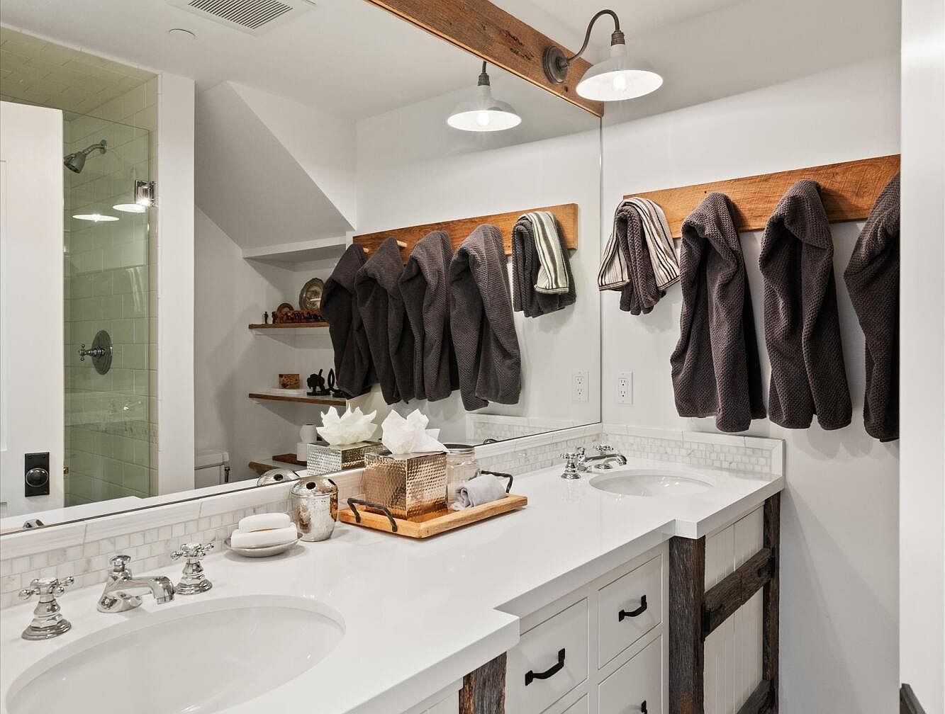 A bright and welcoming bathroom designed with families in mind features a spacious double-sink vanity topped with gleaming white counters for easy cleaning and ample elbow room. Rustic accents shine through the reclaimed wood framing, towel hooks, and barn-inspired cabinetry details, while silver fixtures add a modern touch. Earthy wood shelves tucked into a nook offer practical storage for toiletries and decorative items, keeping essentials within arm’s reach. A row of plush dark towels hung on sturdy hooks provides convenience for multiple family members. Soft, neutral wall colors, subway tile in the shower, and timeless sconces create a warm, inviting, and functional atmosphere.