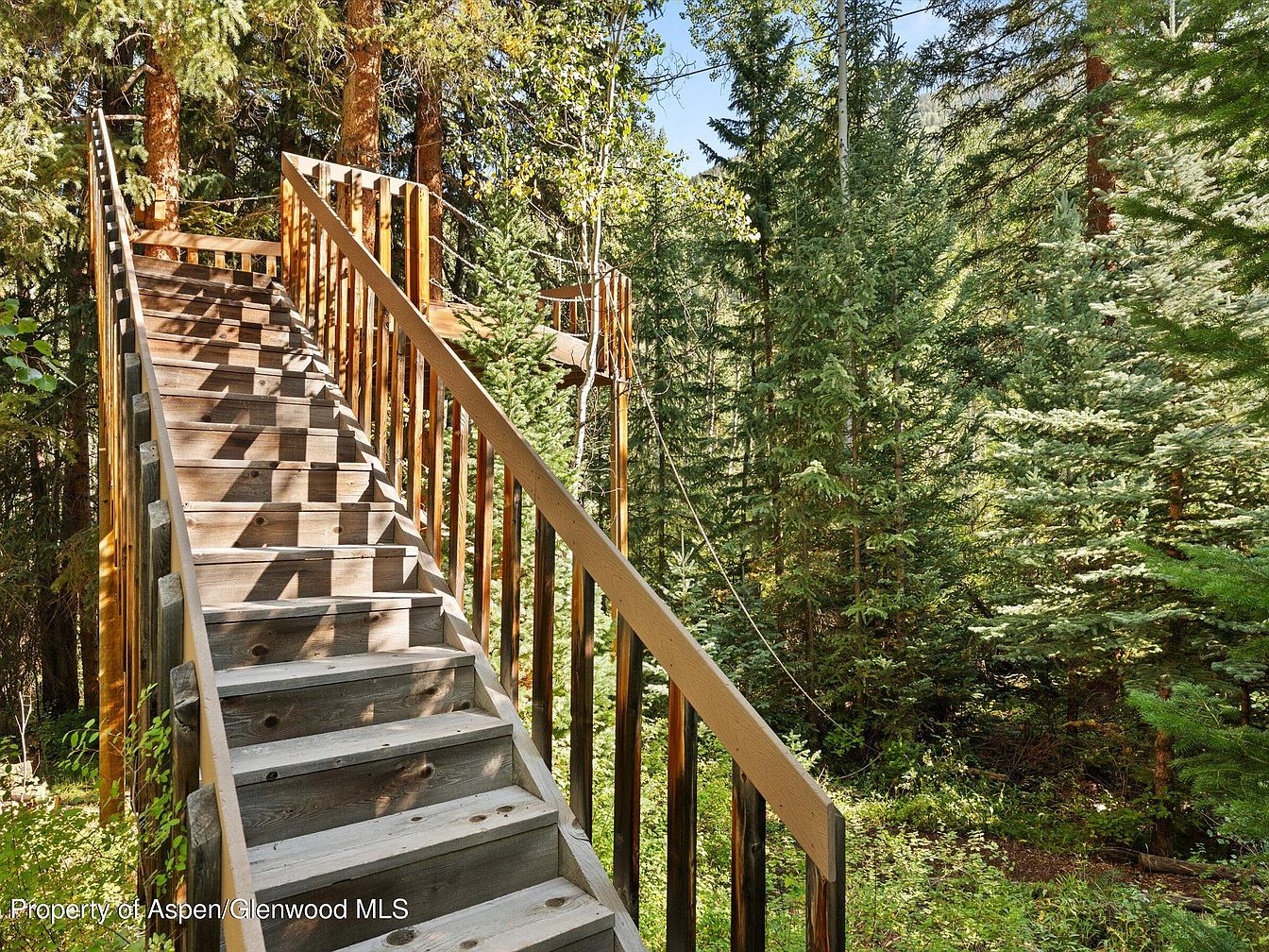 A rustic outdoor staircase crafted from natural wood ascends through a lush forested landscape, blending seamlessly with the surrounding pine trees. The design offers both functionality and aesthetic charm, with sturdy railings for safety, ideal for families with children. Sunlight filters through the dense canopy, casting natural shadows across the colorful wood grains. This elevated path integrates the home into its scenic environment, providing a tranquil route to higher vantage points or a treehouse-style perch. The combination of earthy tones and open-air construction creates a harmonious, adventure-ready feature that encourages outdoor exploration and connection with nature.