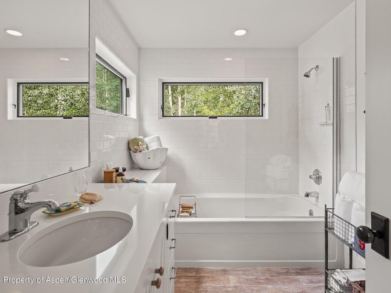 Bright and inviting, this bathroom blends modern simplicity with functionality, making it perfect for families. The dual windows above the tub usher in soft natural light and offer lovely forest views, creating a relaxing ambiance. Sleek white subway tiles line the walls for a clean and timeless look, complemented by spacious counters and under-sink cabinetry for ample storage. Thoughtful touches such as a deep soaking tub, child-friendly step stools, and organized shelving ensure comfort and safety. Warm, neutral flooring adds a cozy contrast, while minimal hardware and uncluttered surfaces enhance the airy, fresh aesthetic of this versatile space.