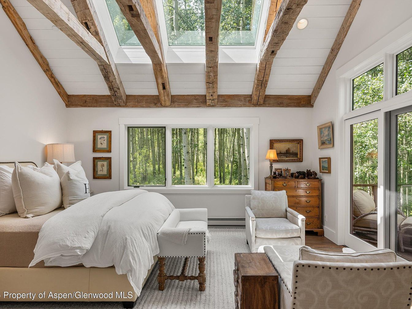 A serene bedroom retreat featuring exposed wooden beams and expansive skylights that fill the space with natural light. The vaulted white shiplap ceiling creates an airy feeling, while the large windows and glass door frame beautiful woodland views. Soft neutral tones on the walls and plush, inviting linens offer a calming atmosphere. Cozy upholstered armchairs and a wooden chest add to the room’s comfort, inviting relaxation and family gatherings. The furnishing balances elegance with practicality, making it family-friendly and welcoming. Thoughtful details, such as classic artwork and a dresser with warm lighting, enhance the overall charm and inspiration for cozy living.