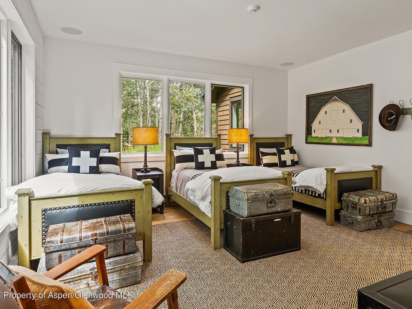 A bright and spacious bedroom perfect for families or children, featuring three twin beds with sturdy, rustic green frames and studded leather accents. Large windows fill the room with natural light and offer serene views of surrounding trees, enhancing the inviting ambiance. The beds are adorned with monochrome cross-patterned pillows and soft white duvets, promoting comfort and simplicity. Vintage storage trunks at each bed’s foot add charm while providing practical storage for toys or linens. Warm wood floors and a geometric area rug complete the cozy setting, complemented by artistic barn-themed wall art and thoughtful reading lamps for an appealing, well-organized retreat.