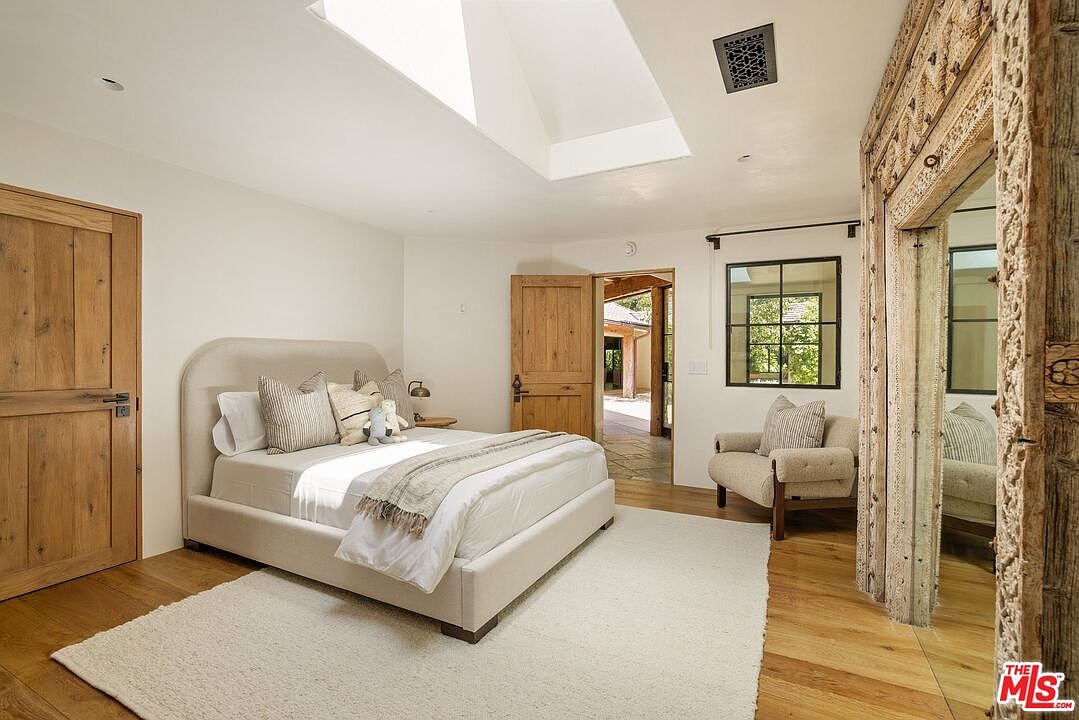 A tranquil bedroom retreat featuring a cozy upholstered bed with soft, layered bedding and neutral throw pillows. Natural wood doors and reflective vintage mirror add warmth and character, while a plush area rug enhances comfort underfoot. An inviting armchair, bathed in light beside a paned window, is perfect for quiet reading or relaxation. Skylights flood the space with daylight, highlighting the serene color palette of whites and warm wood tones. The layout encourages family-friendly living with its spacious open entry and calming ambiance, making it ideal for restful nights and peaceful moments for both adults and children.