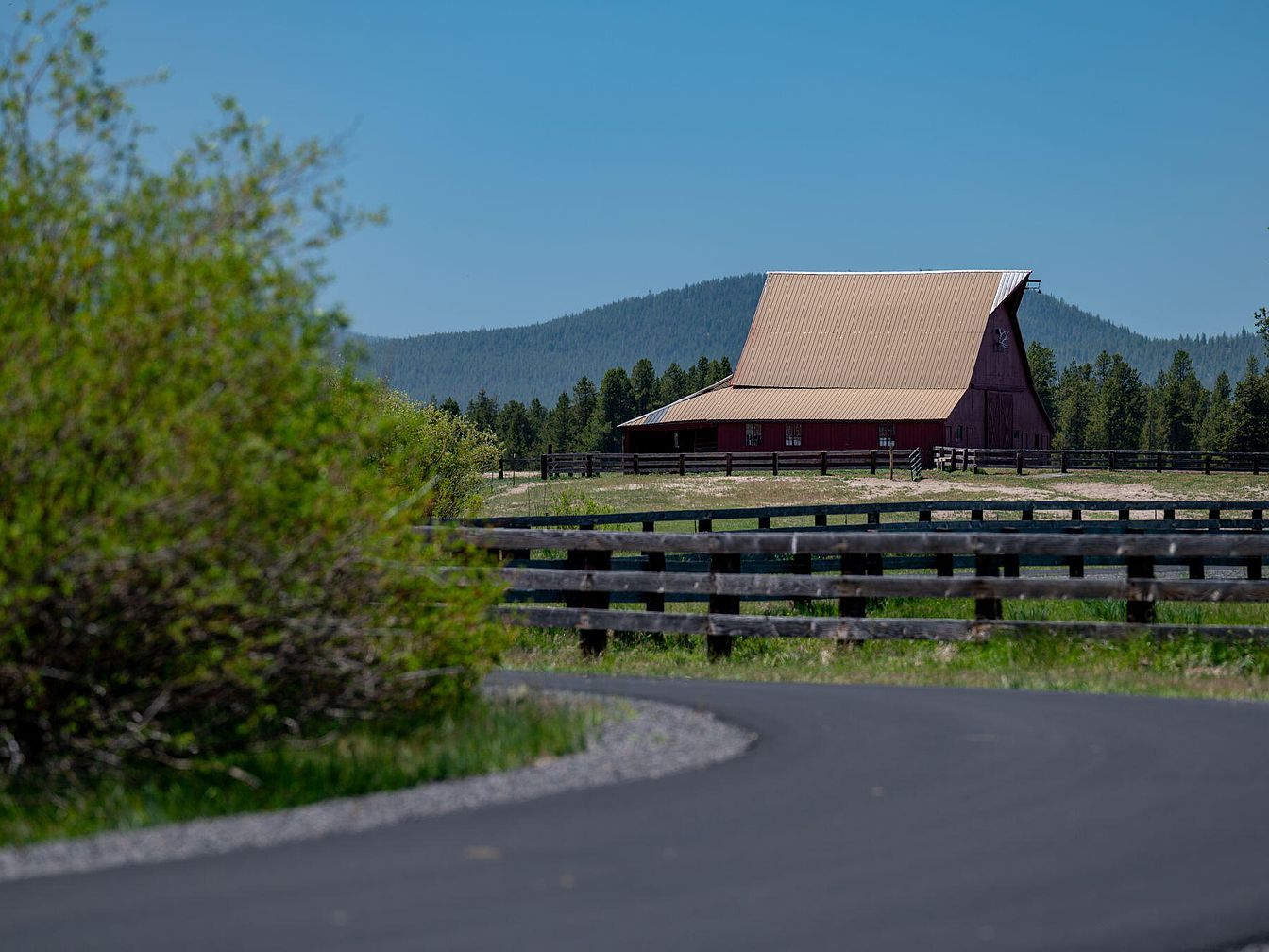 A picturesque red barn sits amidst open fields, framed by rolling wooden fences and a gently winding driveway. A classic tan-sloped roof tops the barn, blending well with the serene rural landscape and distant evergreen forests. The area is spacious and well-kept, ideal for families seeking outdoor activities and connection with nature. The large windows allow natural light inside, and the surrounding greenery offers a peaceful setting for gatherings or children to play. The architectural details highlight traditional American farmhouse charm, while the natural color palette of reds, browns, and greens creates a timeless, inviting look.