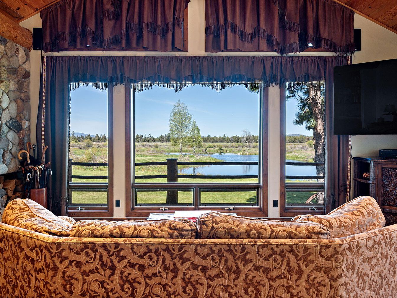 A cozy living room offers an inviting retreat with a plush, ornately patterned sofa positioned to take full advantage of expansive floor-to-ceiling windows. Rich brown drapes frame a stunning panoramic view of a serene pond, grassy fields, and distant trees—a perfect backdrop for family gatherings or quiet evenings. The stone fireplace to the side adds warmth and rustic charm, while the natural wood ceiling enhances the room’s lodge-like ambiance. Soft, earthy tones and classic furnishings create a welcoming, family-friendly environment, where kids can watch wildlife outdoors and parents can relax by the hearth or entertain with ease.