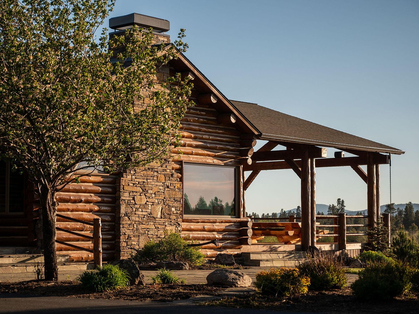 A welcoming front porch showcases the rustic elegance of a classic American log cabin, constructed with sturdy wooden logs and natural stone accents that blend seamlessly with the surrounding landscape. The spacious covered porch features supportive timber beams, perfect for relaxing or entertaining, while offering protection from sun and rain. Large windows provide sweeping views of the outdoors and flood the interior with daylight, creating a cheerful, family-friendly environment. Earthy tones of brown and tan dominate the exterior, complemented by simple landscaping and mature trees, making it an inviting spot for children to play or families to gather and enjoy nature.