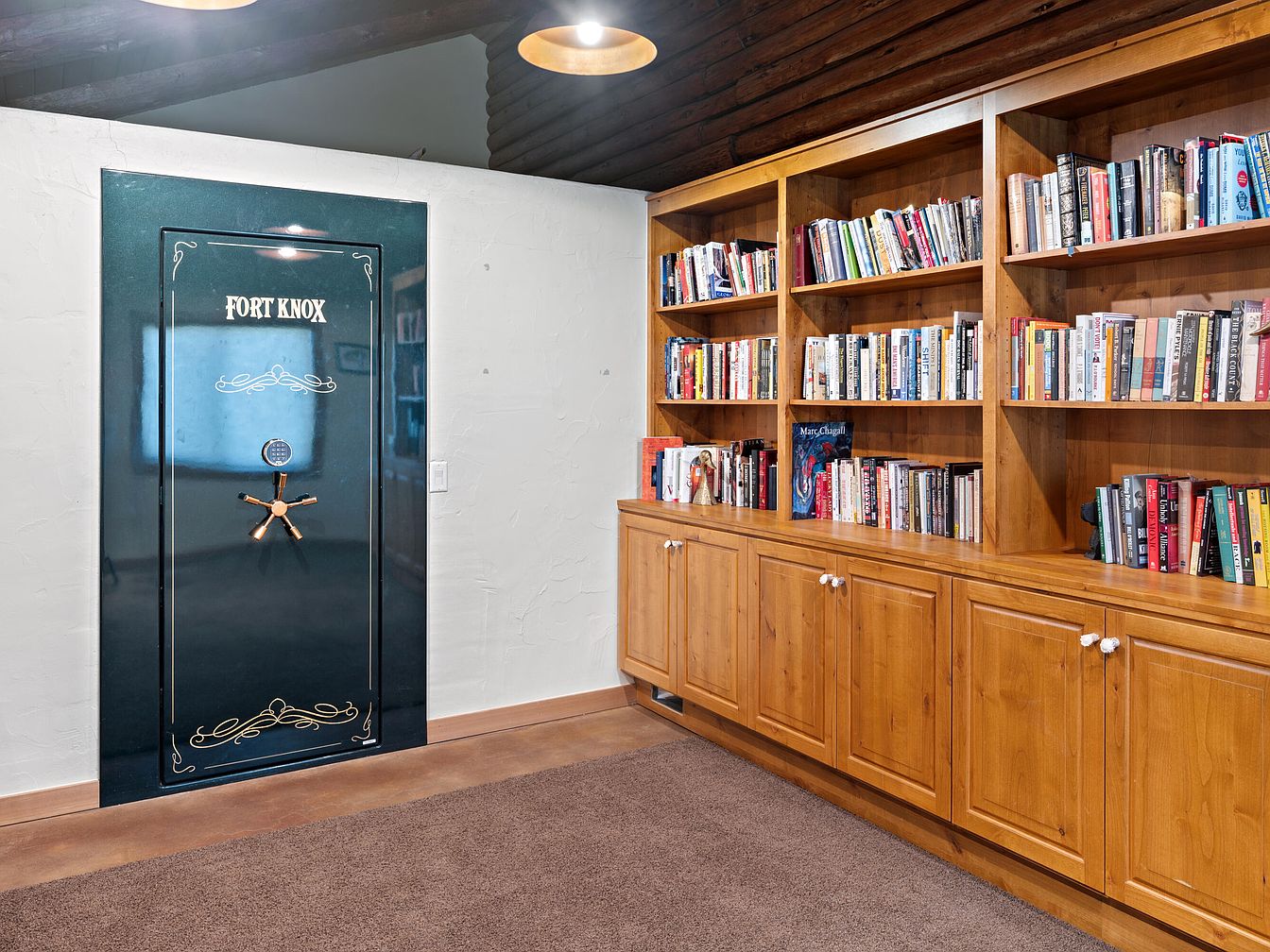 A cozy home library is adorned with warm wooden built-in bookshelves, filled with a variety of well-organized books, making it an inviting space for readers of all ages. The bookshelves offer both open and closed storage, ideal for families to keep prized collections accessible and games or art supplies neatly tucked away. The neutral-toned plush carpet contributes a soft, family-friendly feel, while the rustic wooden ceiling adds architectural character. A large and secure Fort Knox safe is seamlessly set into a textured white wall, providing secure storage for valuables, combining function with classic American home aesthetics.