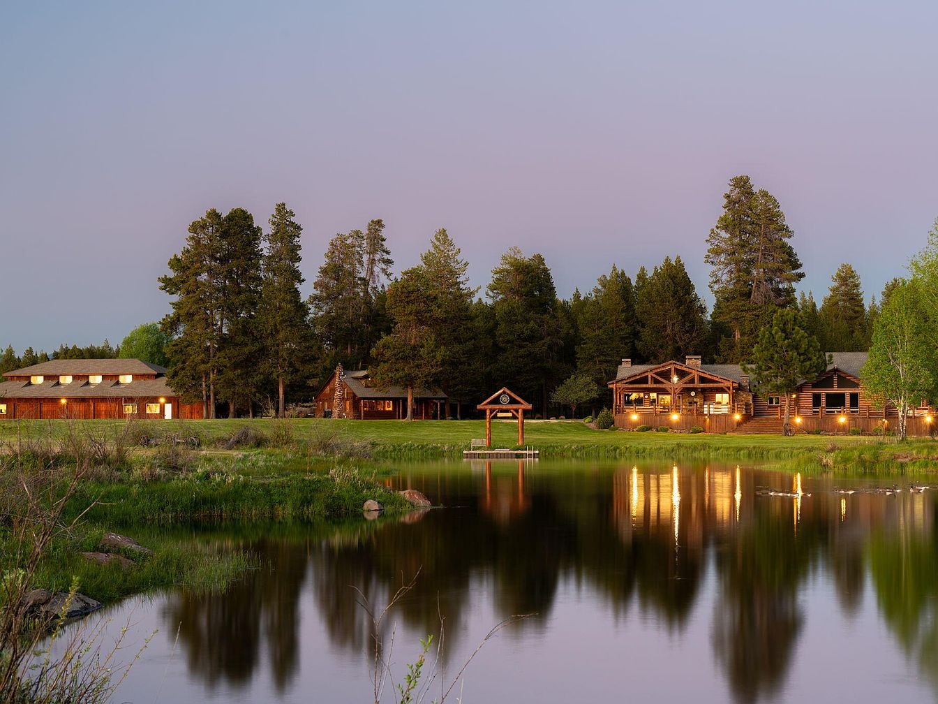 This serene lakeside setting features a collection of rustic log homes nestled among towering pine trees, ideal for a peaceful family getaway. The main cabin boasts a spacious wraparound porch with ample seating, perfect for outdoor gatherings while enjoying scenic water views. Warm exterior lighting creates a welcoming ambiance as dusk falls. The expansive green lawn provides plenty of room for children to play and explore. Natural wood materials and traditional cabin architecture evoke a timeless aesthetic, blending harmoniously with the surrounding landscape. A charming wooden dock and decorative gazebo offer inviting spaces for relaxation by the water’s edge.