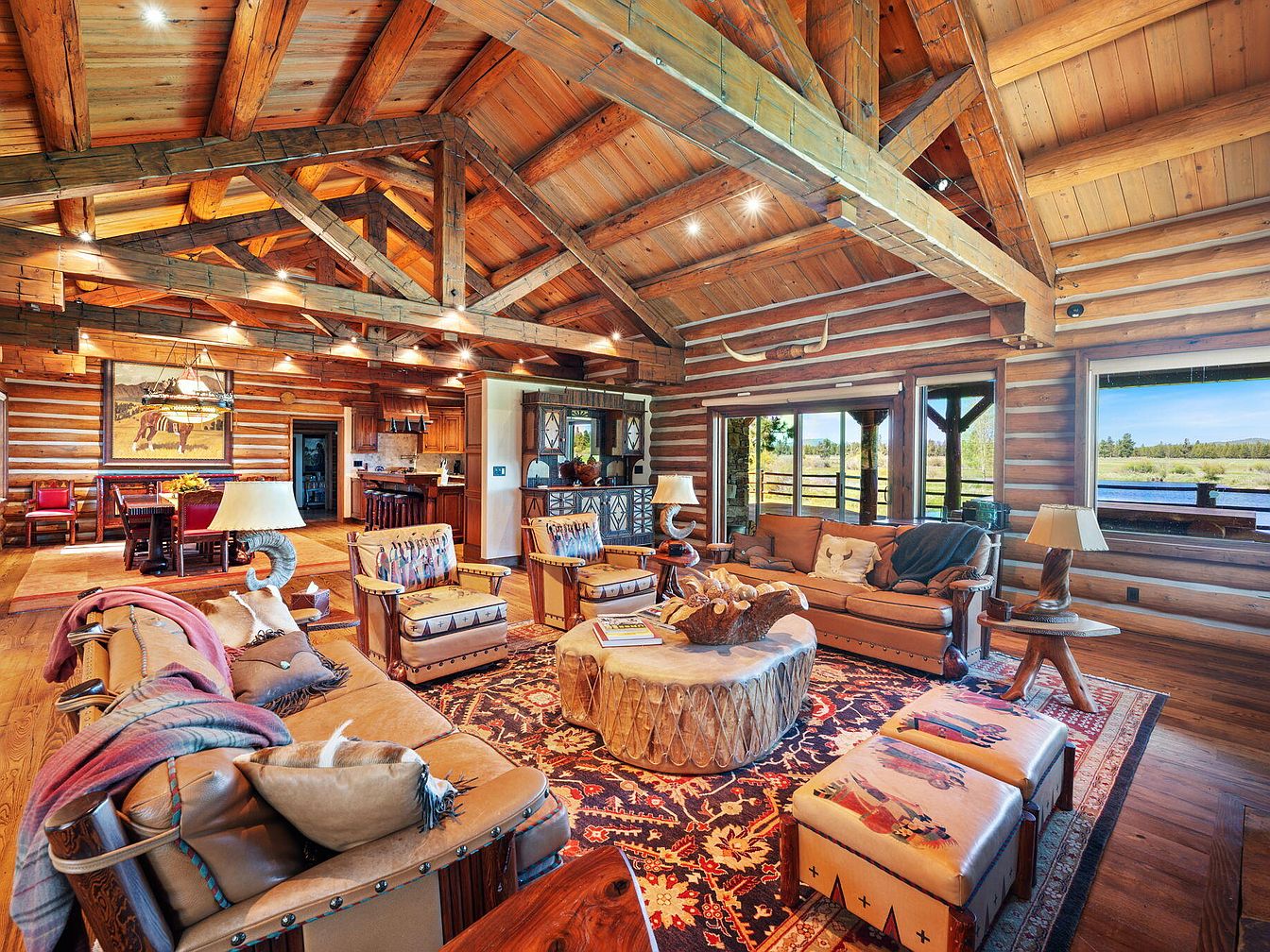 A spacious open-plan living room embodies warm log cabin aesthetics with exposed timber beams and rich wood finishes throughout. Family-friendly and inviting, overstuffed leather sofas and printed armchairs surround a unique drum-inspired coffee table atop a vibrant patterned rug. Natural light pours in through expansive windows, offering sweeping views of the landscape outside, while sturdy wooden furniture and decorative antlers add to the cozy, Western-inspired charm. The open layout flows easily to a dining area and kitchen, making it perfect for gatherings, with earthy tones and rustic textures fostering an atmosphere of relaxation and comfort.