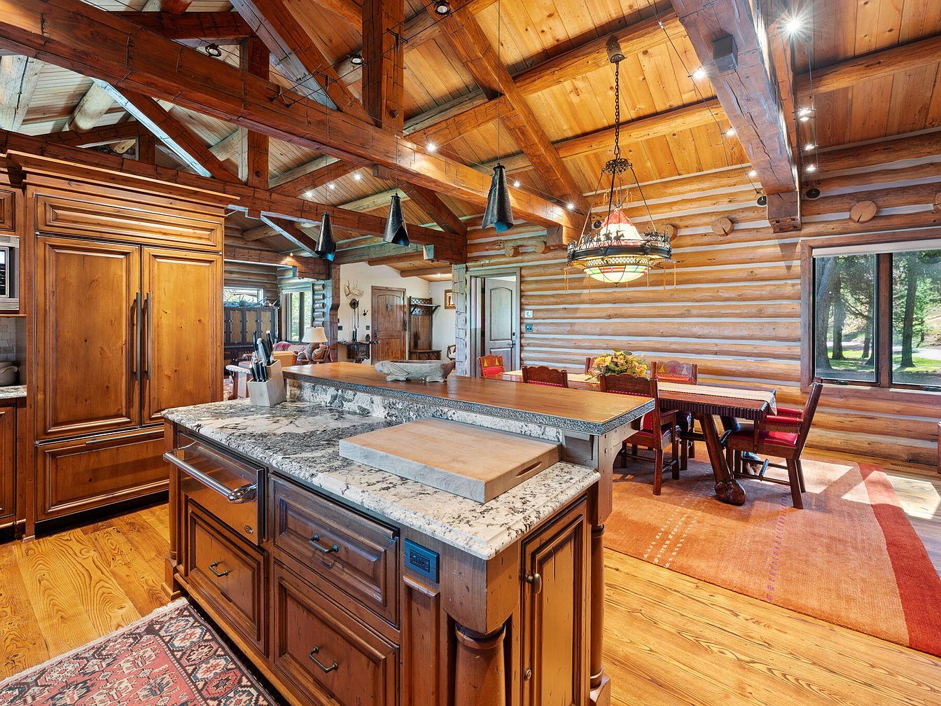Warmth radiates from this expansive open-concept kitchen and dining area, combining cozy family function with rustic elegance. Log cabin walls and wood-beamed vaulted ceilings create a welcoming, lodge-like atmosphere perfect for gatherings. The kitchen is anchored by a large granite-topped island, rich wood cabinetry, and integrated appliances blending seamlessly for a tidy look. Plenty of natural light spills in from wide windows, while earthy red and orange tones in the dining area’s rug and chairs enhance the inviting feel. Spacious yet intimate, this space is ideal for family meals, homework sessions, or entertaining friends in comfort.