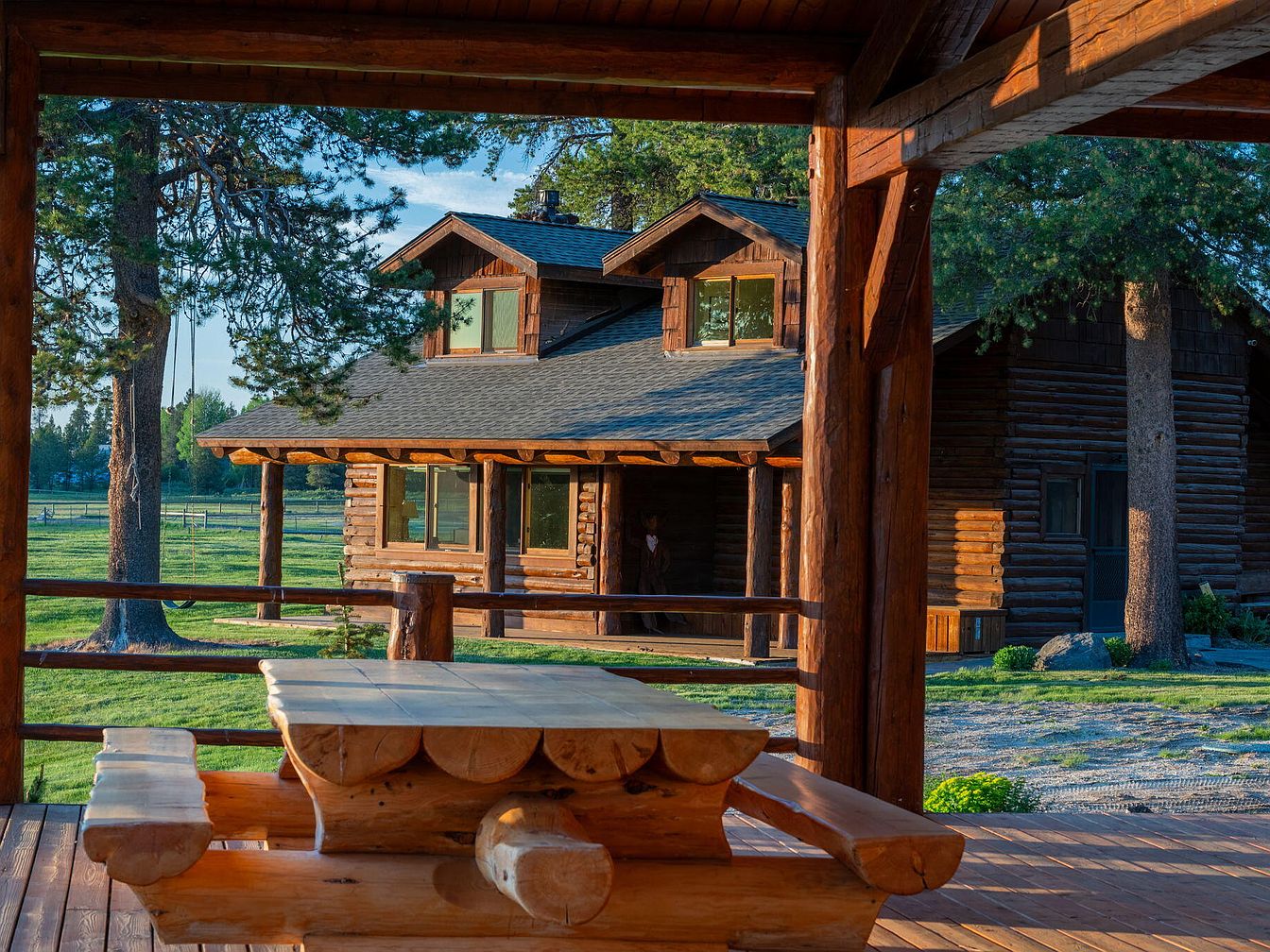 This spacious wooden porch features a sturdy log-built picnic table and bench set, inviting families to gather for meals or relaxation outdoors. Surrounded by thick timber posts and overlooking an expansive green yard, the porch blends seamlessly with the rustic log cabin architecture of the home. The natural wood hues throughout the porch and cabin exterior offer warmth and authenticity, set against tranquil forested views. Ample shade and open space provide a safe, comfortable area for children to play while adults enjoy the peaceful rural atmosphere, making this porch ideal for family bonding and outdoor entertaining.