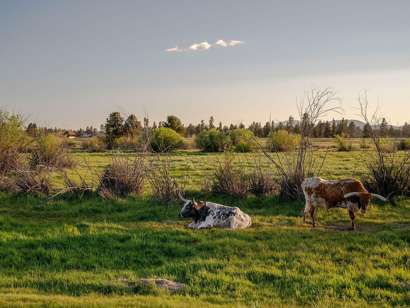 Sweeping green fields stretch outward beneath a clear sky, creating a tranquil, wide-open space perfect for country living. Two longhorn cattle, one grazing and one resting, add a rustic charm and showcase the family-friendly rural lifestyle ideal for those seeking a connection with nature and outdoor activities. The landscape is thoughtfully framed with wild shrubs and distant trees, while a gentle gradient of sunlight illuminates the grass and highlights the natural textures. This backyard or property edge blends seamlessly with the surrounding environment, providing both peaceful scenery and space for children or animals to roam freely.