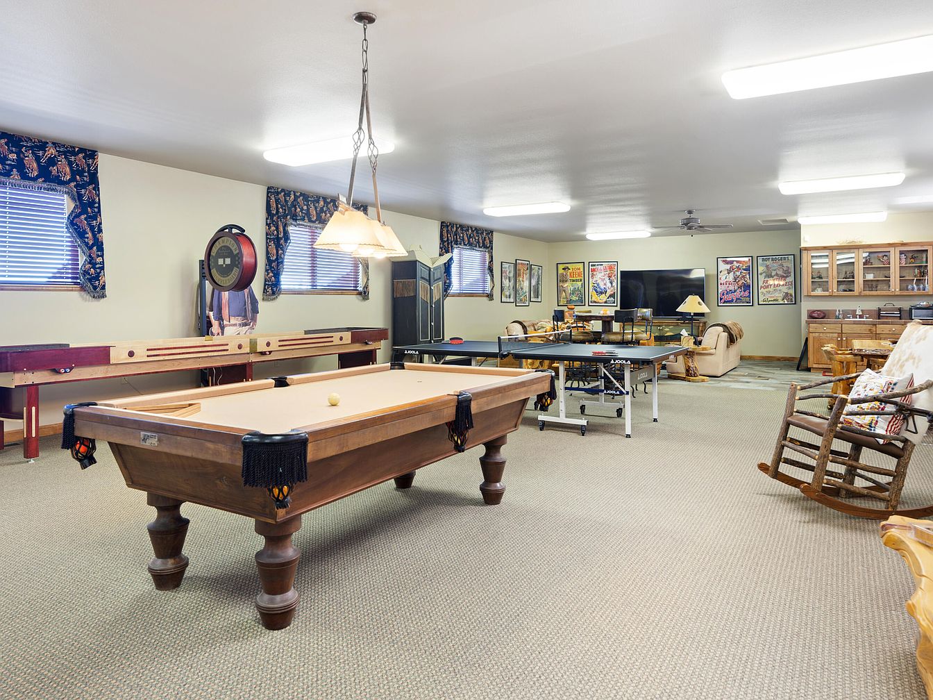 A spacious, family-friendly game room designed for both fun and relaxation, featuring a billiards table, shuffleboard, and a ping-pong table at the center. Cozy seating with large, comfortable sofas and rustic wooden rocking chairs creates an inviting lounge area facing a big-screen TV. The walls are adorned with colorful vintage posters, adding personality and charm, while patterned valances dress wide windows, letting in abundant natural light. Warm neutral carpeting and soft, cream-colored walls make the space feel welcoming. Glass-front cabinetry and casual wood furnishings add a touch of classic Americana, perfect for gatherings and family game nights.