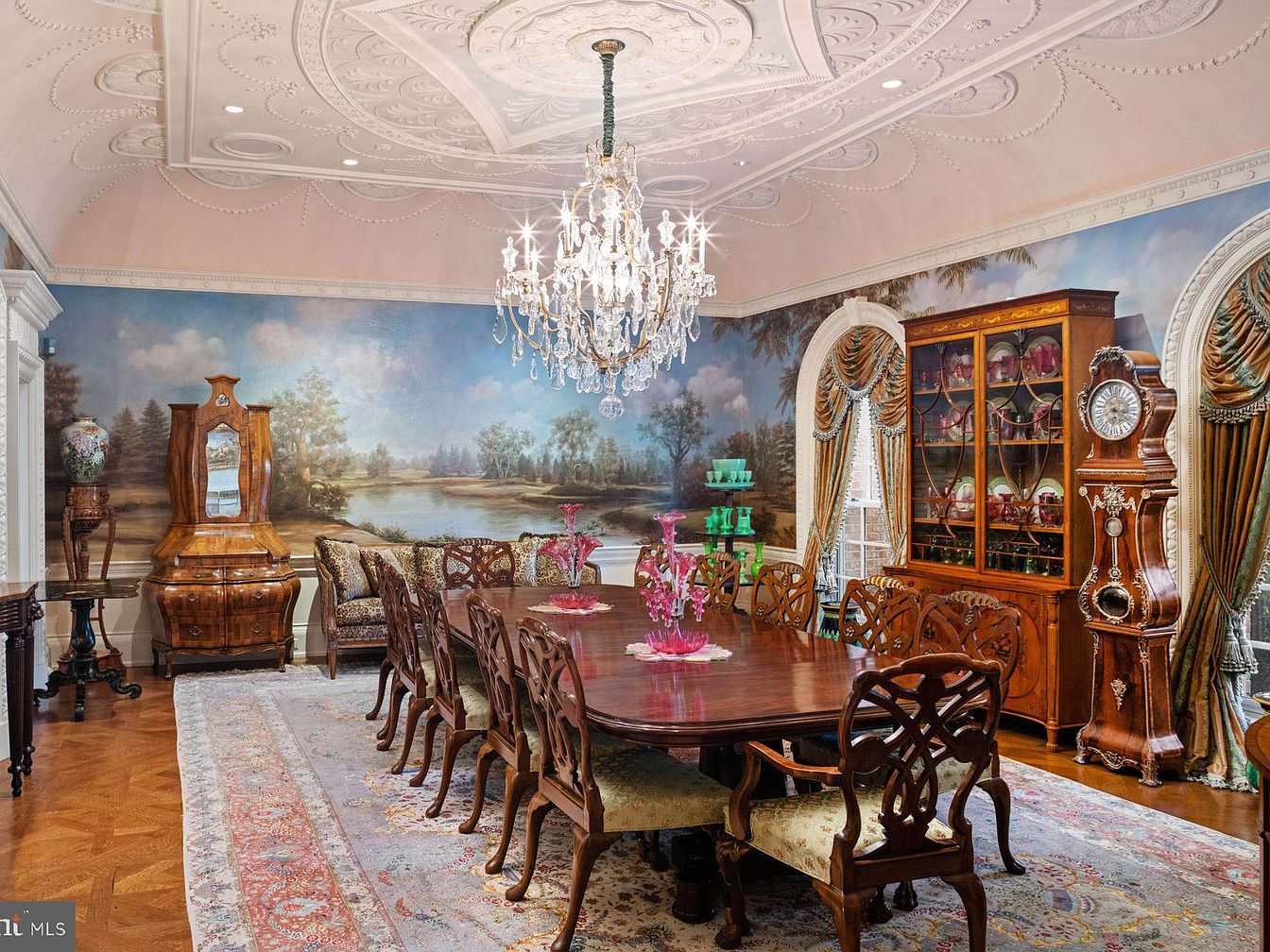 This exquisite dining room features a grand table surrounded by intricately carved chairs, inviting family gatherings. The room is bathed in a warm, pastel color scheme, highlighted by the sophisticated chandelier that cascades light, enhancing the ornate embossed ceiling. A stunning mural of serene landscapes adorns the walls, seamlessly blending natural beauty with classic elegance. A vintage cabinet displays vibrant glassware, complementing the rich wooden furniture. Luxurious drapes frame the windows, adding texture and charm. The intricate area rug anchors the space, offering comfort while maintaining a timeless aesthetic that resonates with both casual and formal dining experiences.