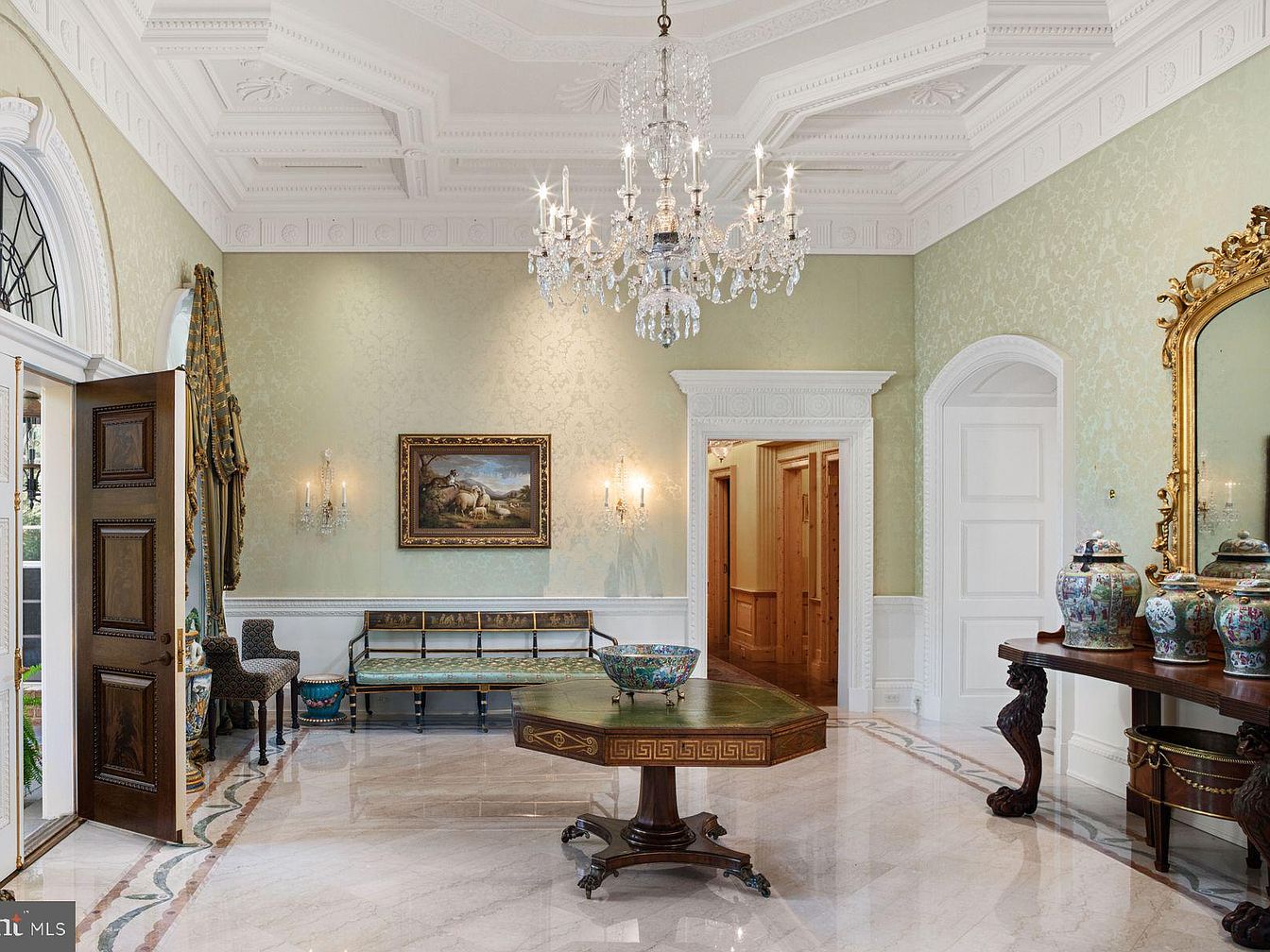This stunning foyer welcomes guests with its grandeur, featuring high ceilings adorned with intricate crown moldings. Soft, light green walls create a serene backdrop, complemented by a magnificent chandelier that casts a warm glow. The polished marble flooring showcases an elegant pattern, while a beautifully crafted wooden table with intricate detailing serves as a stunning centerpiece. An antique-inspired bench offers a cozy seating area, accented by tasteful decor including a striking painting and ornate vases. This family-friendly entryway balances sophistication with comfort, making it a perfect introduction to the home’s refined atmosphere.