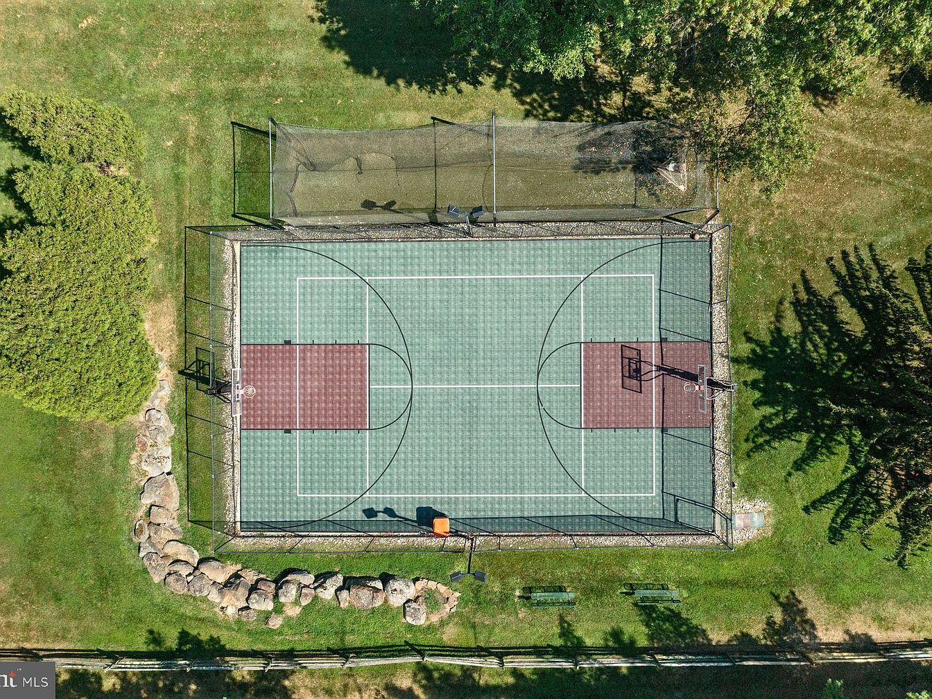 This beautifully designed sports court blends seamlessly into the landscaped yard, surrounded by lush greenery and well-maintained grass. The court features a dual-sport layout, designated for basketball and tennis, providing ample space for family fun and exercise. Surrounded by protective netting and rustic stone borders, it’s both safe and visually appealing. Benches line the perimeter, perfect for spectators or relaxation in between games. The vibrant colors of the court’s surface add a lively touch, making it a centerpiece for active outdoor living. This well-equipped area inspires both play and leisure for all ages.