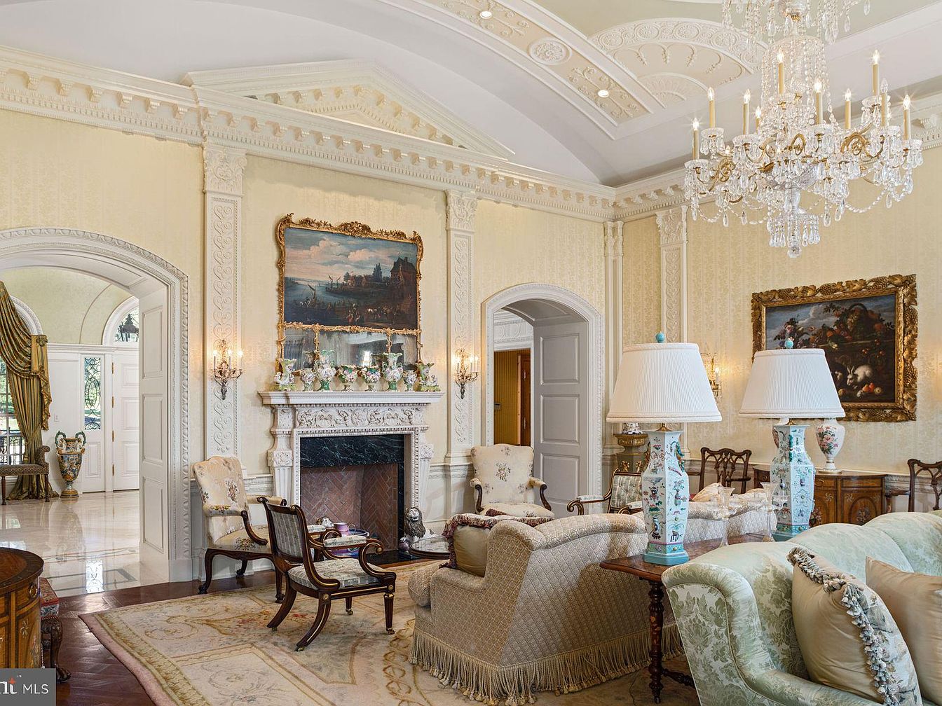 This elegantly designed living space features high, coffered ceilings adorned with intricate moldings that embody luxury. A plush, light-colored sofa, accented with decorative pillows, invites relaxation, while ornate armchairs enhance the opulent atmosphere. Rich wooden furniture and a chic marble fireplace create a warm focal point, alongside beautiful artwork that adorns the pastel walls. Crystal chandeliers softly illuminate the room, enhancing its grandeur. The intricate area rug adds texture and warmth, making the space family-friendly and welcoming. Natural light flows through arched doorways, connecting this serene area with the rest of the home, inviting comfort and refined style.