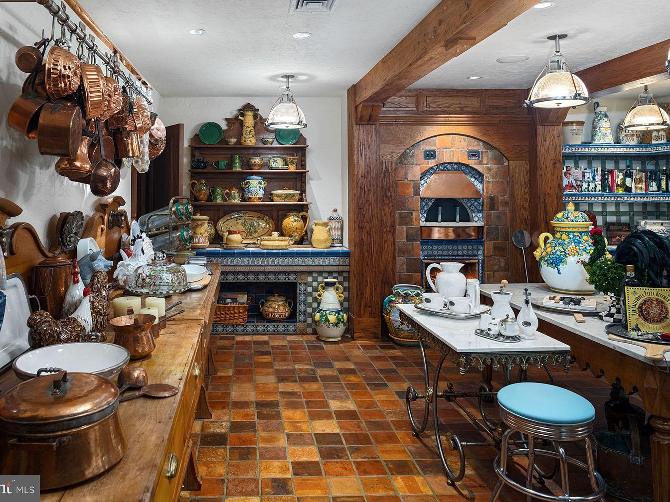 This charming kitchen showcases a blend of rustic elegance and vibrant decor, perfect for family gatherings. Warm terracotta tiles complement the rich wood cabinetry, while an array of hanging copper pots adds a touch of traditional charm. The design features open shelving filled with colorful ceramics and antiques, creating an inviting and personalized atmosphere. A distinctive tile-trimmed arch highlights the built-in pizza oven, enhancing the kitchen’s functionality. Bright accents, like the retro-style blue stool, bring a playful note to the space. Ample countertop space ensures convenience, making this kitchen a true heart of the home.