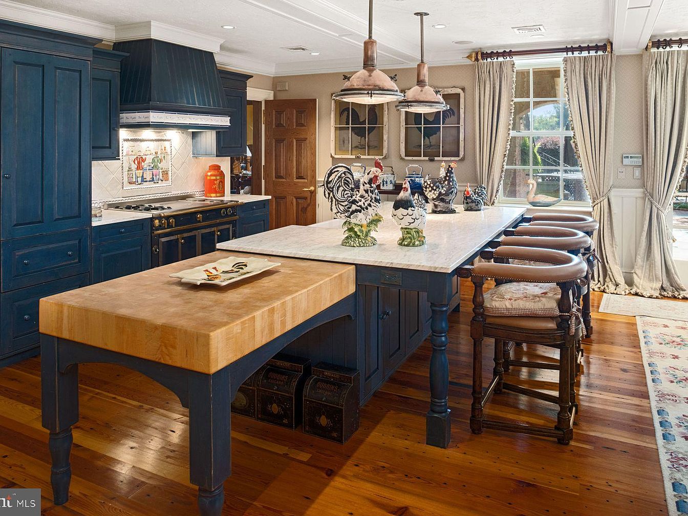 This kitchen features a striking centerpiece island, crafted with a warm wooden surface paired with bold blue cabinetry. The island invites gatherings with its ample space and elegant barstools, perfect for family breakfasts or casual gatherings. The cabinetry offers generous storage while showcasing exquisite craftsmanship. A charming backsplash adds a touch of art, enhancing the overall aesthetic of the space. Accented by stylish pendant lights, the ambiance is both inviting and functional. Natural light floods in from large windows, highlighting the polished wooden floors, which enrich the warm color palette, creating a cozy and family-friendly atmosphere.